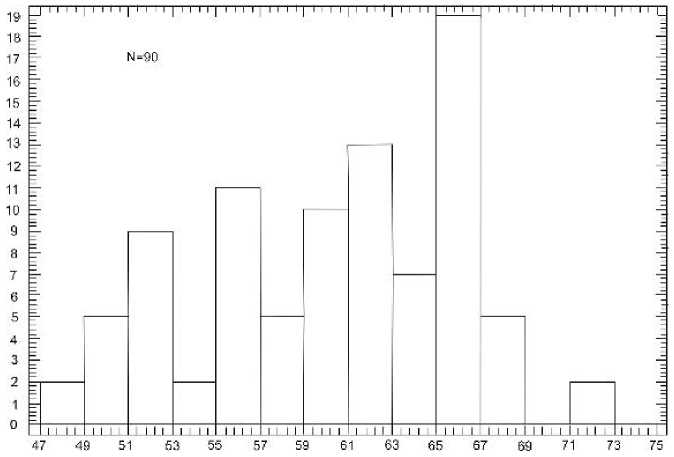 Рис. 3. Гистограмма распределения кремнезема в вулканитах верхнеуральской толщи. N – количество определений.
