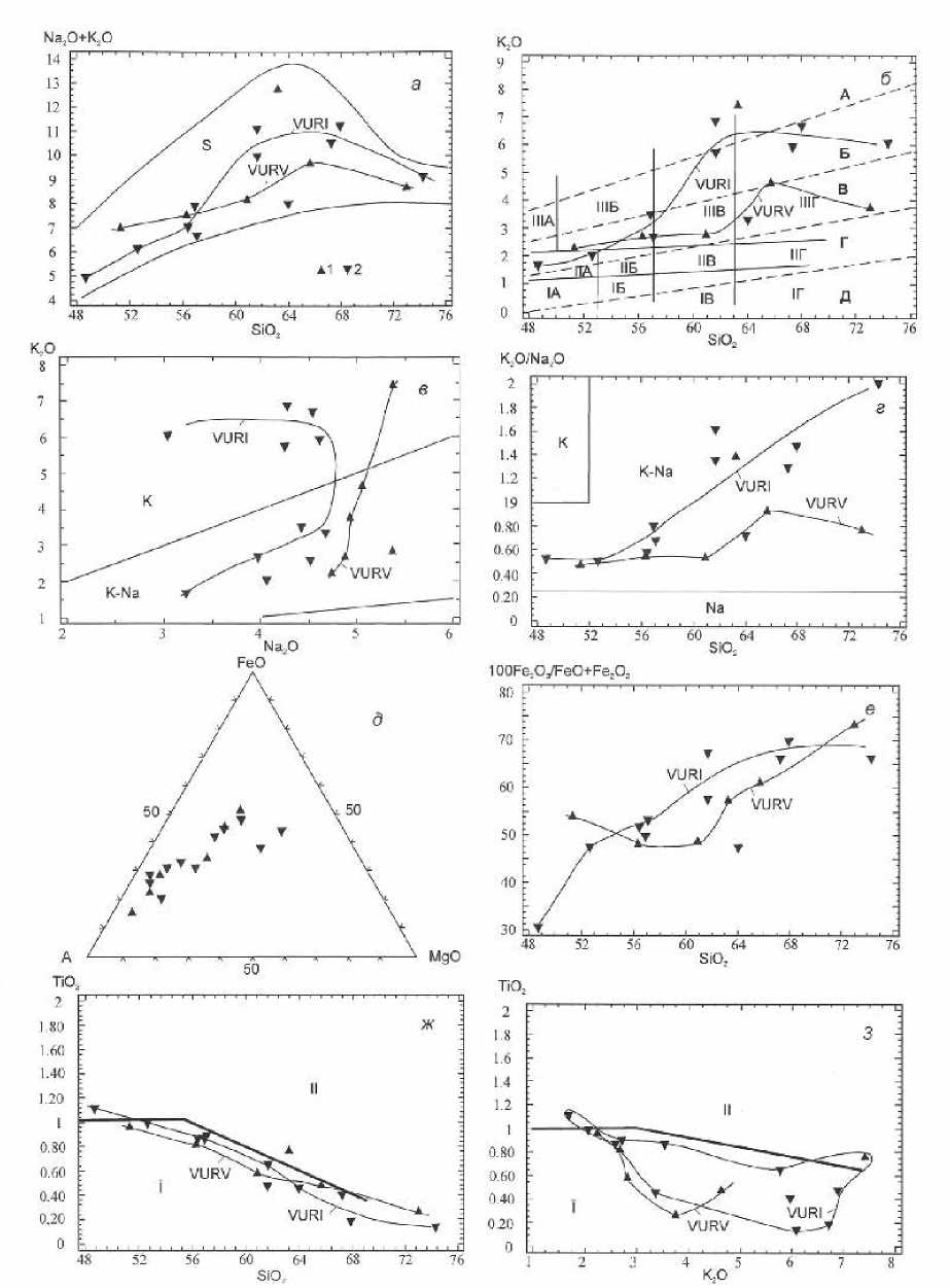 Fig. 4. Binary diagrams for average rock compositions of the Verkhneuralsk volcanic-plutonic association. 1 – volcanic rocks of the Verkhneuralsk Sequence; 2 – intrusive rocks of the Verkhneuralsk complex. Numbers of triangles correspond to those in Table 1. Trends of evolution or fields of compositions of volcanic rocks of the Verkhneuralsk Sequence (VURV) and intrusive rocks of the Verkhneuralsk complex (VURI) and fields: a – subalkaline rocks (S); б – ultra-K (A), high-K (Б), normal-K (В), low-K (Г) and K-free (Д) series, simplified after (Peccerillo, Taylor, 1976); absarokite (IIIA), shoshonite (IIIБ), latite (IIIВ), toscanite (IIIГ), high-K basalt (IIA), high-K basaltic andesite (IIБ), high-K andesite (IIВ), high-K dacite (IIГ), basalt (IA), basaltic andesite (IБ), andesite (IВ) and dacite (IГ), simplified after (Mackenzie, Chappel, 1972); в, г – K, K-Na and Na rocks; ж, з – low-Ti (I) and high-Ti (“rift-related”) (II) shoshonite, after (Kepezhinskas et al., 1988).