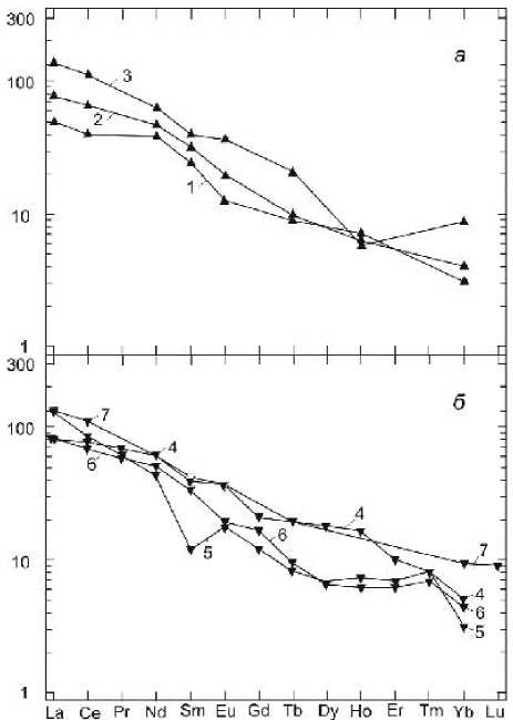 Содержание РЗЭ в интрузивных породах верхнеуральского комплекса приведено в табл. 3. Распределение РЗЭ в субщелочном лейкократовом габбро, кварцевых монцодиоритах и сиенитах показано на рис. 7б. Все типы пород, также как и комагматичные вулканиты, характеризуются резким преобладанием легких РЗЭ над тяжелыми, при этом в спектрах пород отмечаются как положительные, так и отрицательные Eu аномалии, что отражает сложные процессы фракционирования полевых шпатов и пироксена в магматическом очаге. Уровень содержаний РЗЭ в интрузивных породах аналогичен таковому в комагматичных вулканитах верхнеуральской толщи и соответствует распределению РЗЭ в породах шошонитовых серий островных дуг. На диаграмме соотношений нормированных по хондриту отношений La/Yb и La/Sm фигуративные точки анализов интрузивных пород верхнеуральского комплекса вместе с аналогичными точками комагматичных вулканитов верхнеуральской толщи образуют единое поле на продолжении тренда обогащения внутриплитного магматического источника (рис. 8). Магматический источник первичных магм верхнеуральской вулкано-плутонической ассоциации уверенно идентифицируется как метасоматически обогащенная мантия – источник центрально-итальянского типа (Кепежинскас и др., 1988). Эти породы отличаются высокими отношениями РЗЭ (табл. 3), что в характерно именно для низкотитанистых, собственно субдукционных шошонитов (Кепежинскас и др., 1988).