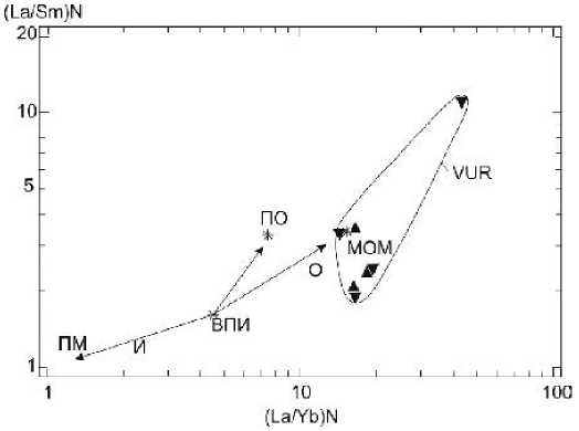 Рис. 8. Диаграмма (La/Yb)N–(La/Sm)N для пород верхнеуральской ассоциации (VUR). Показаны отношения РЗЭ для примитивной мантии (ПМ), внутриплитного источника (ВПИ) и пелагических осадков (ПО), а также тренды истощения (И), контаминации (К) и обогащения (О) внутриплитного источника, рассчитанные по данным (Кепежинскас и др., 1988). Остальные обозначения см. на рис. 4.