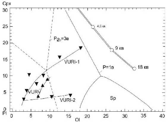 Fig. 9. Position of average normative compositions of igneous rocks of the Verkhneuralsk association on diagram of melting of the plagioclase–clinopyroxene–olivine system (Frolova et al., 1989). For symbols, see fig. 6.