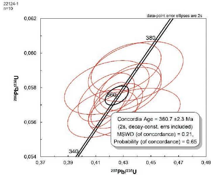 Выделенные цирконы – светло-розовые и прозрачные, желтые и полупрозрачные или мутные. Последние представляют собой обломки субидиоморфных длиннопризматических кристаллов, большинство с трещинами. Длина циркона варьирует от 214 до 550 мкм. В катодной люминесценции цирконы характеризуются умеренно-ярким и умеренным свечением и магматической зональностью или ее следами. По результатам U-Pb датирования для всех измеренных цирконов получен конкордантный возраст 360.7 ± 2.3 млн. лет (табл. 4, рис. 10). Содержания U в них составляют 165– 1055 г/т, Th – 108–1092 г/т при незначительных вариациях Th/U отношения (0.62–1.07). Полученные данные подтверждают позднедевонский (фаменский) возраст верхнеуральского комплекса.