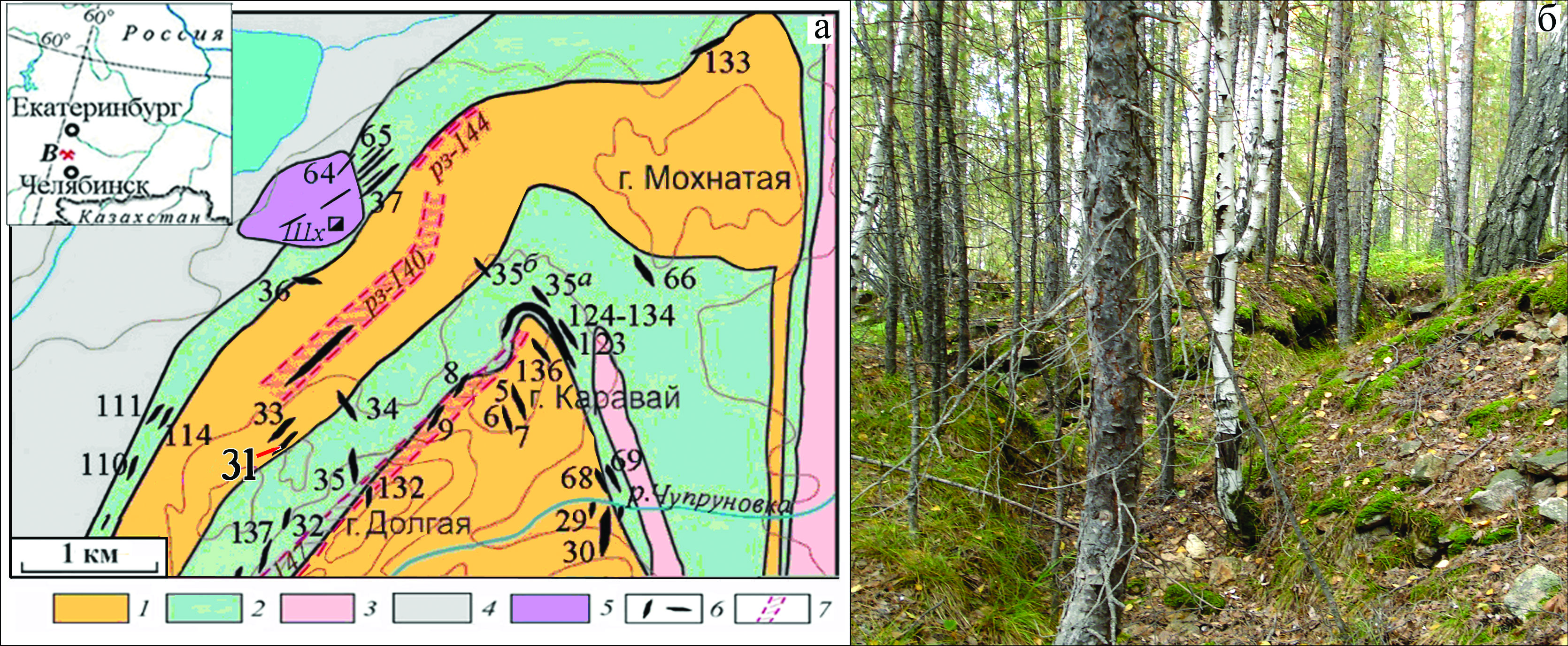 Fig. 1. Position of pegmatite vein no. 31 on schematic geological map of the northern part of the Vishnevye Mountains (Popova et al., 2021); б – overview of old mines in vein no. 31 (photo by A.M. Kuznetsov). 1–5 – country rocks: 1 – miaskite; 2 – alkali syenite and fenite; 3 – granite gneiss; 4 – plagiogneiss, crystal schist, amphibolite, quartzite; 5 – serpentinite; 6 – veins of alkali pegmatites; 7 – ore zones.