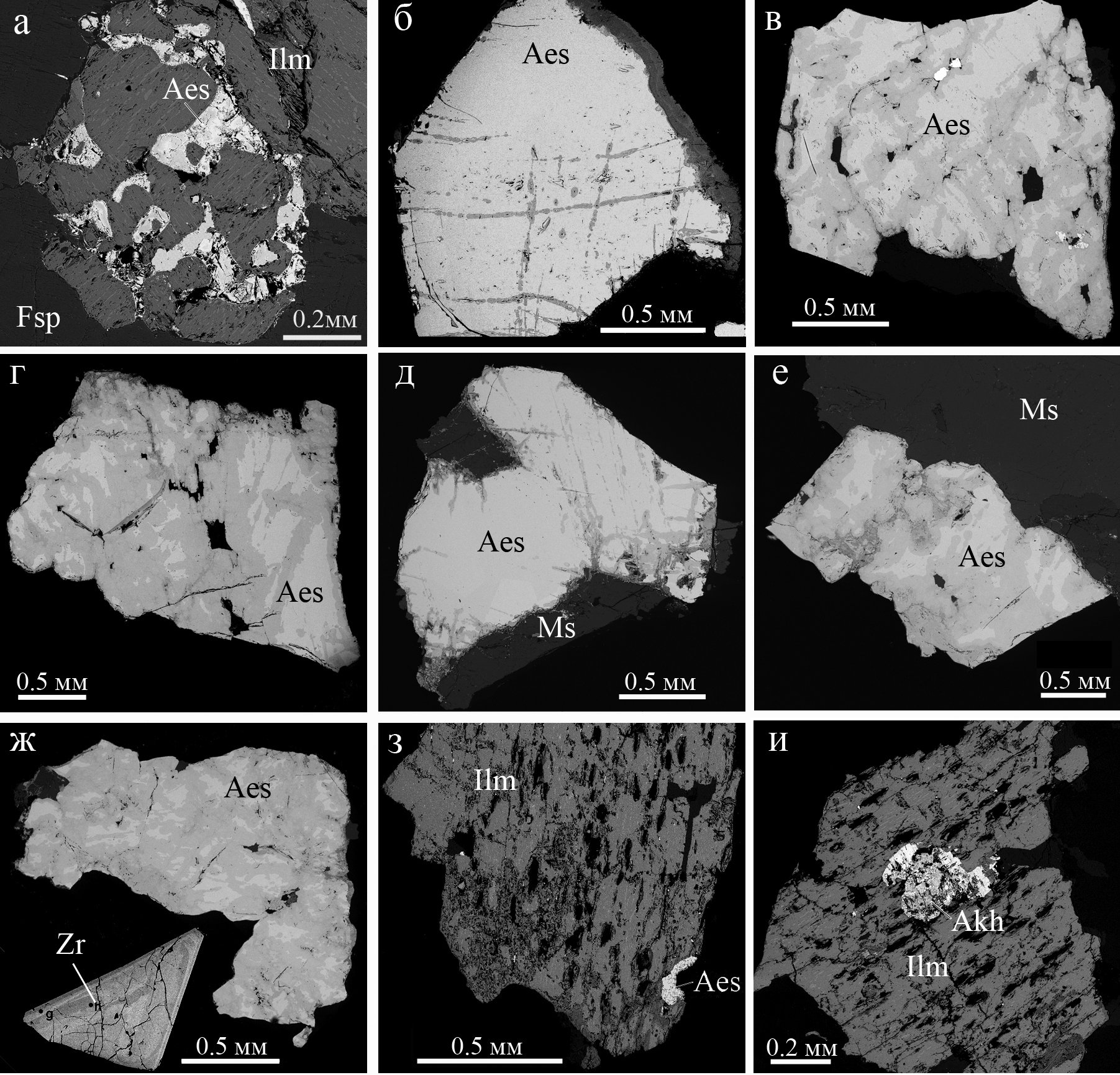 Рис. 2. Зерна и агрегаты эшинита из жилы № 31: а – эшинит (Aes) в ильмените (Ilm) с вростками ориентированных табличек титаномагнетита; б – эшинит с зональной коркой замещения (справа и вдоль трещин); в – измененное зерно эшинита с включениями мусковита (черное) и торита (белое); г – эшинит с изменениями вдоль трещин; д – измененный вдоль тонких трещин эшинит в парагенезисе с мусковитом (Ms); е – измененный эшинит с образованием округлых метасоматических текстур; ж – измененное зерно эшинита с реликтовыми участками первичного эшинита и цирконом (Zr); з – синтаксический сросток ильменита с магнетитом, ориентированными вростками мусковита (черное), эшинита и порами растворения; и – ильменит-магнетитовые сросток с вростками мусковита, эшинита и предполагаемого ахалаита (Akh). BSE-фото.