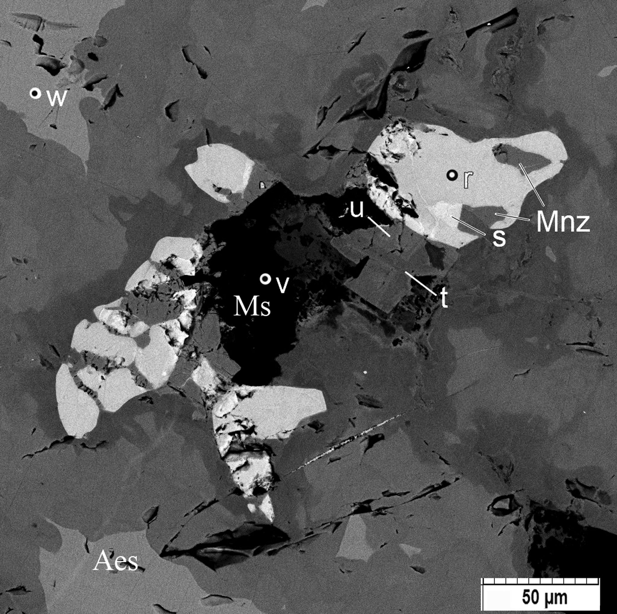 Торит встречен в виде вростков в эшините, синхронных с монацитом (рис. 3, точки r и s). По составу минерал неоднороден (табл. 2, ан. 1r, 2s). Монацит обнаружен в срастаниях с торитом и мусковитом; секториален по составу (рис. 3, точки u и t) (табл. 2, ан. 3u, 4t).