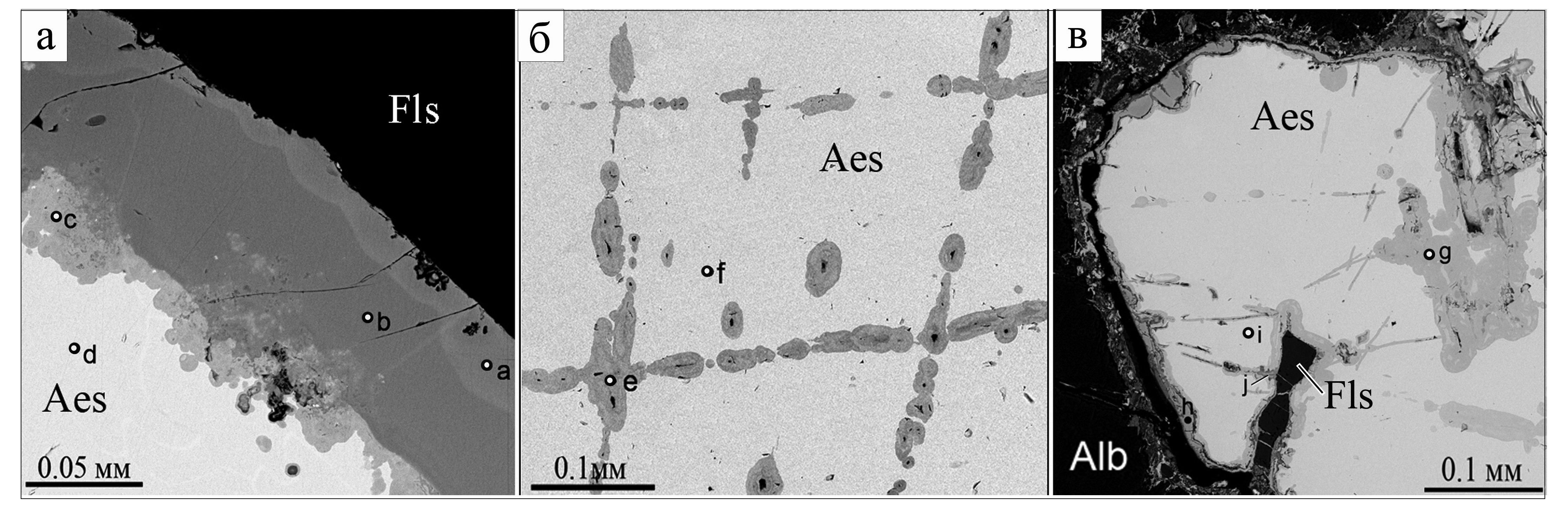 Рис. 6. Округлые зональные текстуры метасоматических изменений в эшините (участки d, f, i). Alb – альбит, Fls – калиевый полевой шпат. BSE-фото.