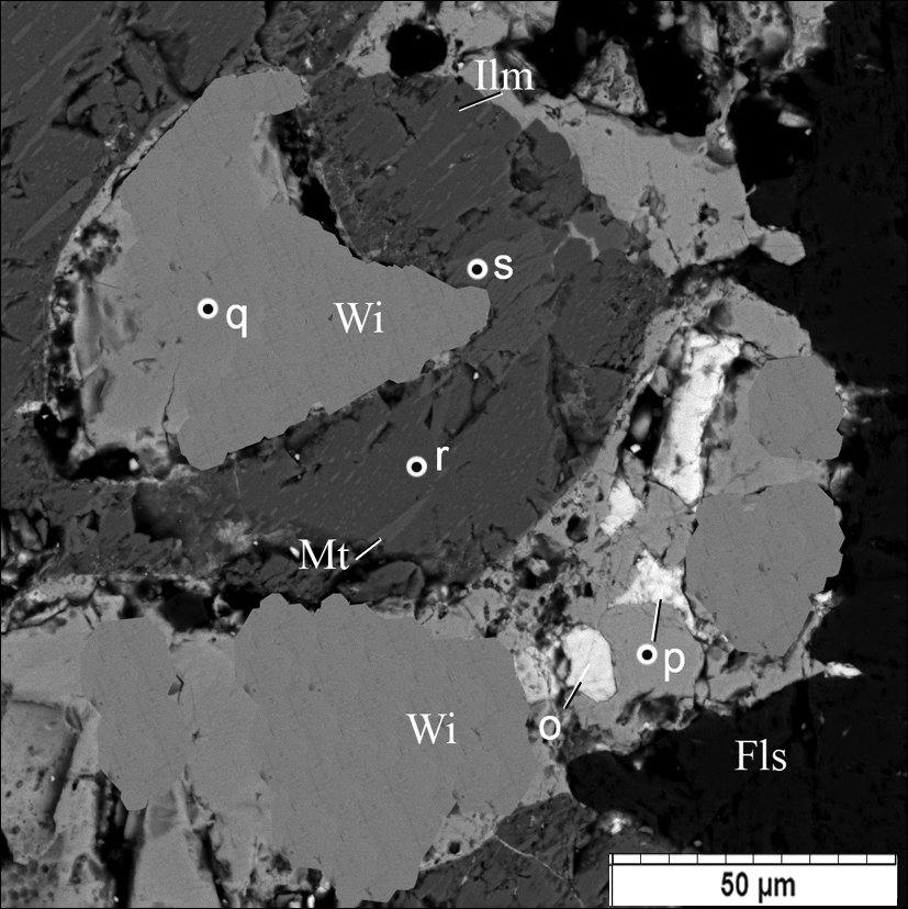 Рис. 8. Парагенезис «виджеццита» Wi (q), «ишикаваита» (o) и «манганоколумбита» (p) с ильменитом Ilm (r) и титаномагнетитом Mt (s) в калиевом полевом шпате Fls. BSE-фото.