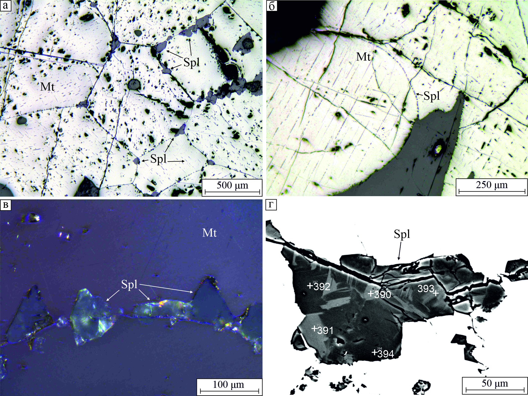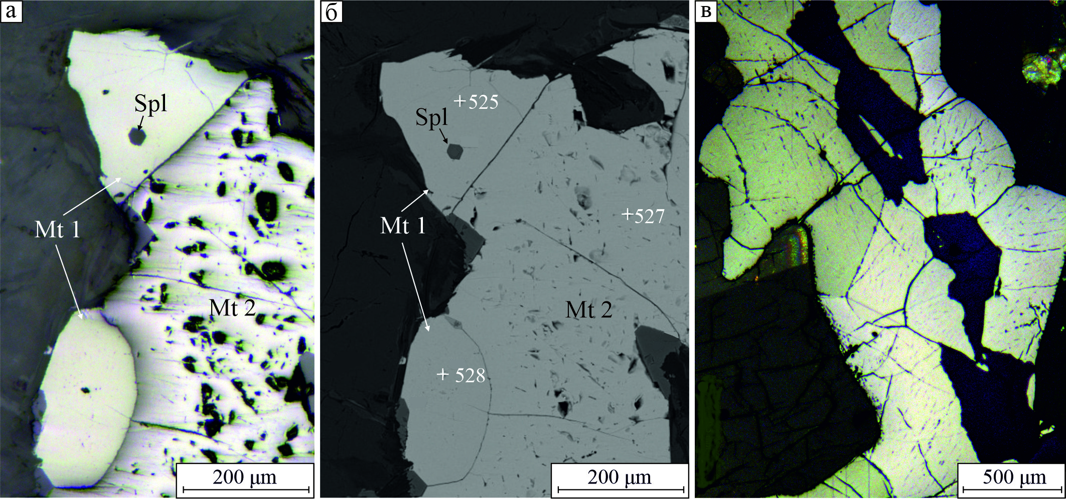 Рис. 1. Две разновидности магнетита (Mt): а – отраженный свет; б – BSE-фото; в – слабая анизотропия магнетита (отраженный свет с анализатором). Здесь и далее: Spl – шпинель.