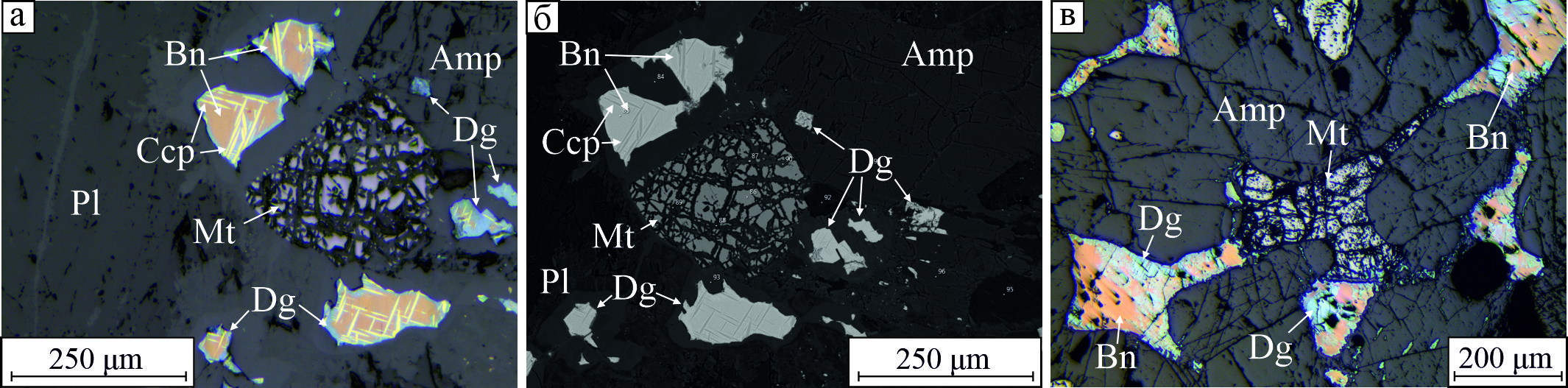 Fig. 2. Fractured magnetite in assemblage with Cu sulfides. Reflected light (а, в); BSE-image (б). Hereinafter: Amp – amphibole, Bn – bornite, Ccp – chalcopyrite, Dg – digenite, Pl – plagioclase.