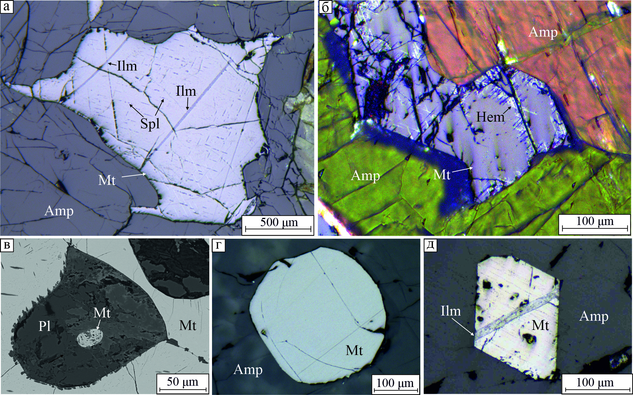 Fig. 3. Morphological types of magnetite: а, б – interstitial in amphibole; в – rounded crystal in plagioclase; г – crystal with combined plane-faceted and rounded surface in amphibole; д – plane-faceted crystal in amphibole. Reflected light (а, в–д); reflected light with analyzer (б); BSE-image (в). Hereinafter: Hem – hematite, Ilm – ilmenite.