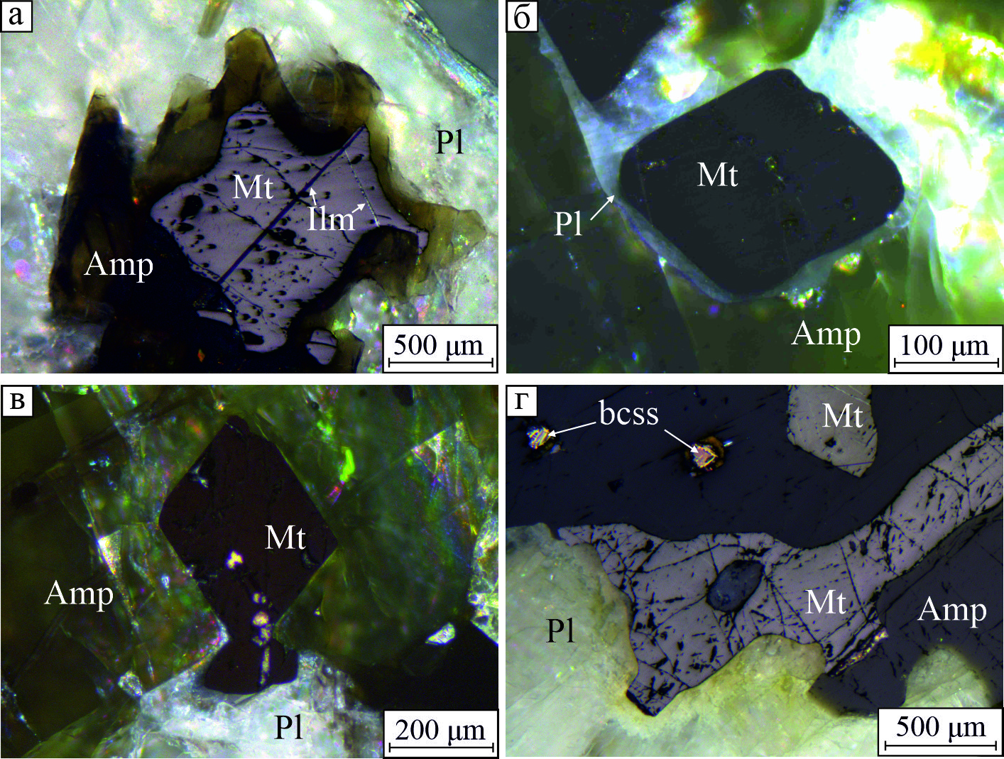 Fig. 4. а – сonformable amphibole rim around magnetite; б – plagioclase rim between amphibole and euhedral magnetite grain; в – euhedral and anhedral magnetite relatively to amphibole and plagioclase, respectively; г – saussurite rim along the contact of magnetite and plagioclase. bсss – grains with bornite-chalcopyrite exsolution structure. Reflected light (а, г), reflected light with analyzer (б, в).