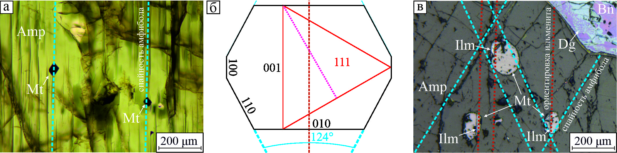 Широко распространены закономерные срастания магнетита с породообразующими силикатами, преимущественно, амфиболом. В амфиболе встречаются мелкие идиоморфные кристаллы магнетита, которые закономерно ориентированы относительно вмещающей кристаллической силикатной матрицы, что видно по их параллельной ориентировке и совпадению оси четвертого порядка октаэдрических кристаллов магнетита с направлением спайности амфибола (рис. 5а). В ряде случаев выявляется закономерная ориентировка округлых выделений магнетита по отношению к вмещающему амфиболу, которая устанавливается по относительной ориентировке пластинчатых кристаллов ильменита в магнетите и спайности в амфиболе. Замер ориентировки линейных элементов в шлифе (рис. 5б) показал, что пластинки ильменита в трех скругленных монокристалах магнетита имеют параллельную ориентировку, которая практически совпадает с биссектрисой угла между линиями выхода плоскостей спайности амфибола на поверхность аншлифа. Возможность закономерного срастания магнетита и роговой обманки с параллельной ориентировкой [111] магнетита и [001] роговой обманки отмечена в работе (Минералы..., 1967). Наблюдаемое срастание магнетита и амфибола также объясняется такой закономерностью (рис. 5). Если принять угол между плоскостями спайности в амфиболе в 124º, то след от одной из октаэдрических граней магнетита, с которой совпадает ориентировка пластинчатых кристаллов ильменита, на плоскости третьего пинакоида амфибола должен совпадать с биссектрисой острого угла между плоскостями спайности.
