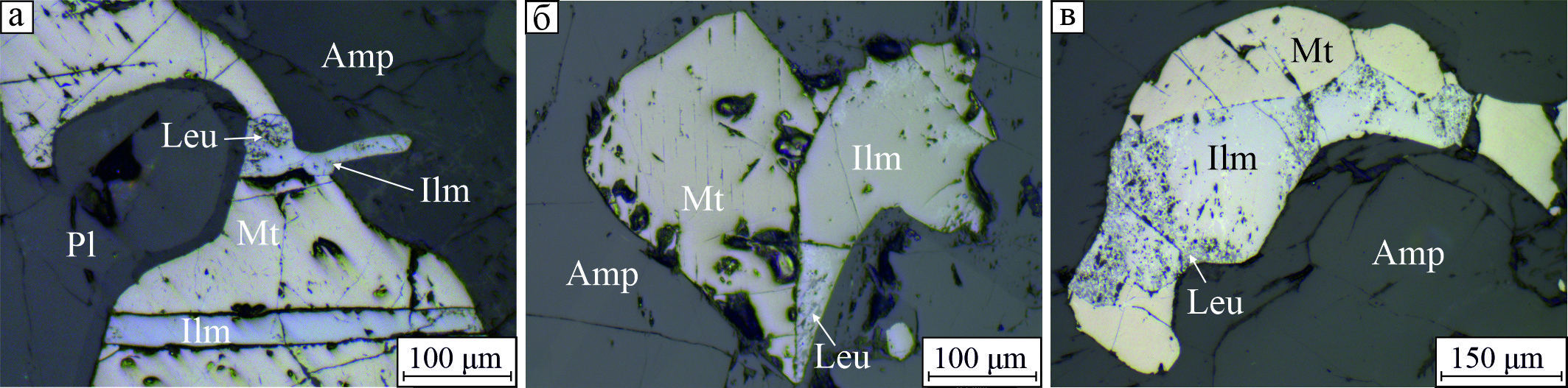 Рис. 6. Варианты присутствия ильменита за пределами магнетита: а – частичное проникновение кристалла ильменита за пределы магнетита; б, в – срастание равновеликих кристаллов магнетита и ильменита в амфиболе. Leu – лейкоксен. Отраженный свет.