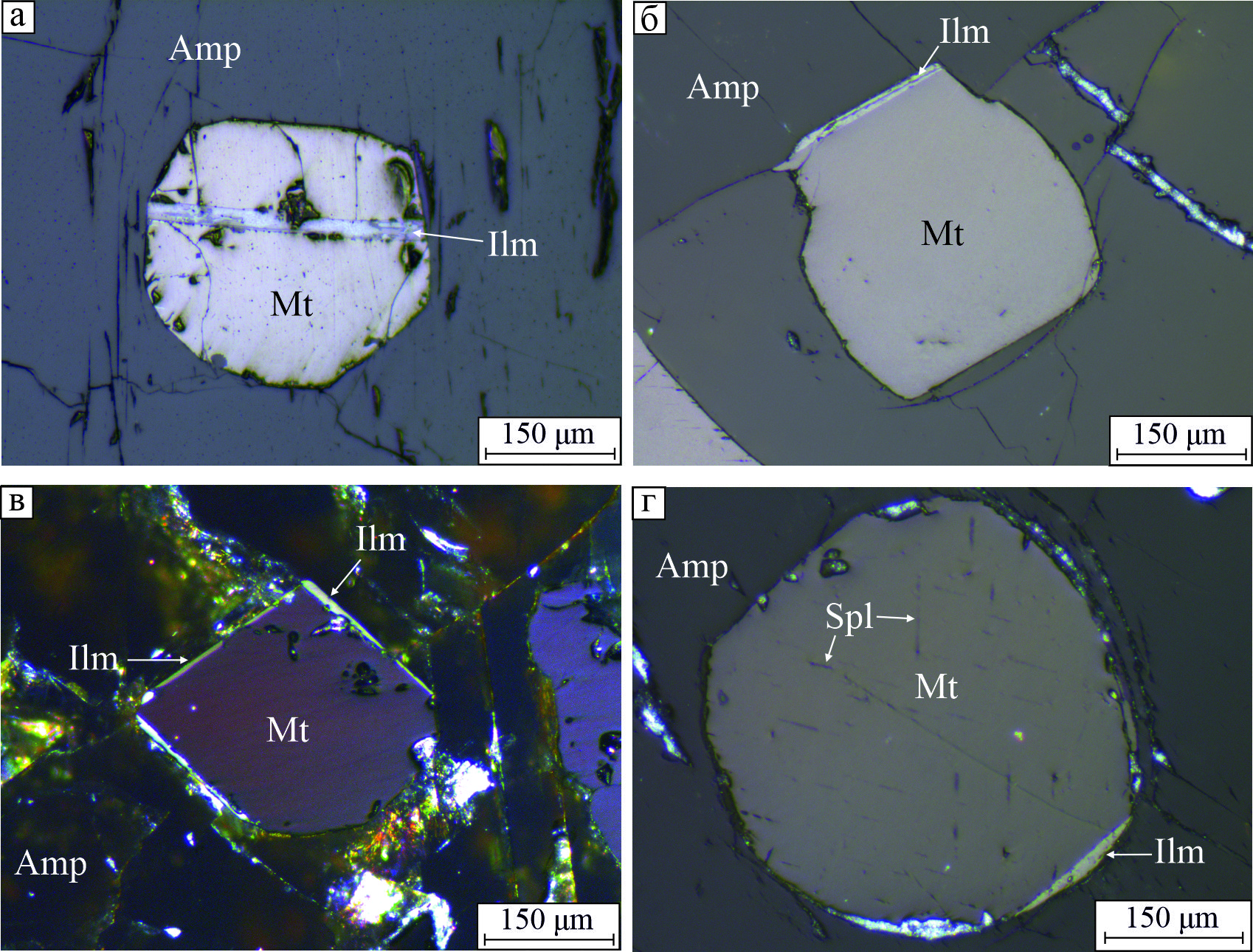 Fig. 7. Relationships of ilmenite with magnetite crystals: а – ilmenite crystal in magnetite; б – ilmenite crystal at the contact of magnetite with amphibole; в – ilmenite crystals along the contact of three faces of magnetite with amphibole; г – ilmenite crystal with flat and round boundaries between magnetite and amphibole, respectively. Reflected light (а, б, г), reflected light with analyzer (в).