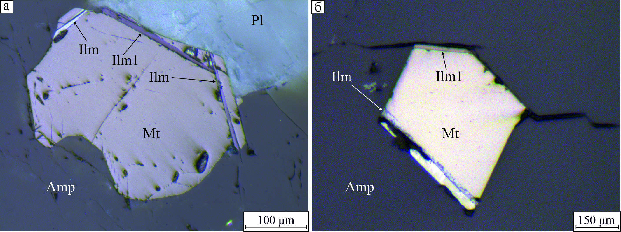 Fig. 8. Regular (Ilm) and random (Ilm1) orientation of ilmenite plates relatively to the faces of magnetite crystals: reflected light with (a) and without (б) analyzer.