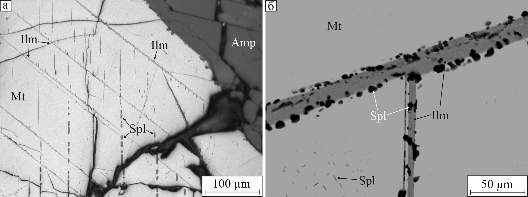 В образцах практически не встречаются характерные для магнетита решетчатые структуры с закономерно ориентированными пластинчатыми кристаллами ильменита по {111} магнетита, которые обычно интерпретируются как типичные структуры распада твердого раствора. Близкие по морфологическим особенностям пластинчатые выделения ильменита (рис. 9а) всегда представлены совместными срастаниями со шпинелью без характерного для структур распада твердого раствора выклинивания разноориентированных пластинок ильменита в области их сочленения (рис. 9б).