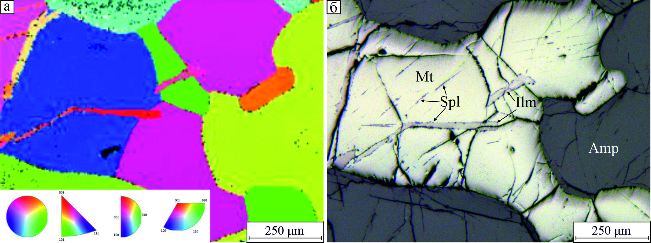 Рис. 10. Пересечение пластинчатыми кристаллами ильменита границ разноориентированных зерен магнетита: а – дифракция обратно-рассеянных электронов; б – отраженный свет.