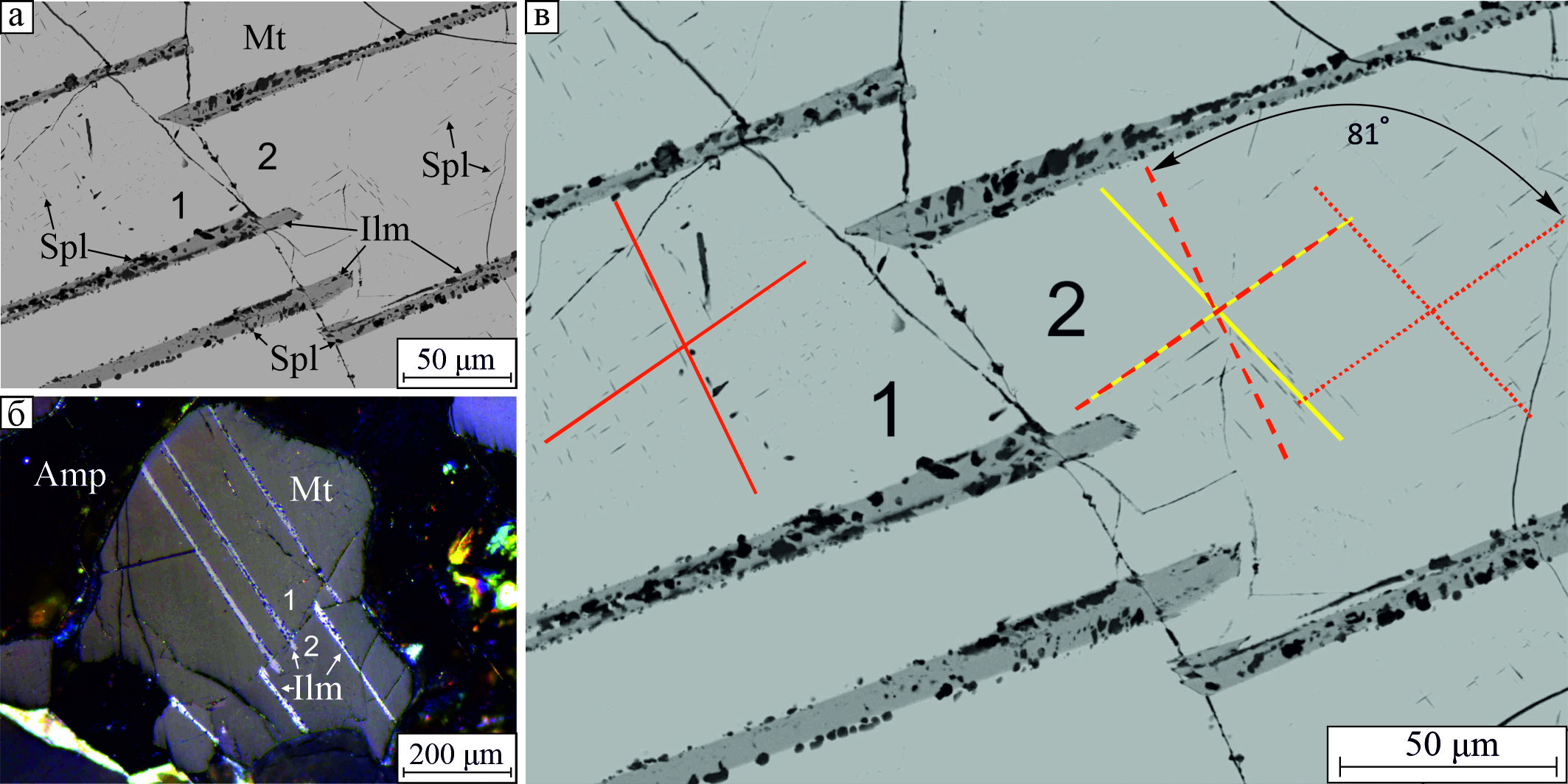 Рис. 11. Пересечение пластинчатыми кристаллами ильменита границы разноориентированных кристаллов магнетита 1 и 2. Красные и желтые линии – взаимная ориентировка шпинелевых пластинок распада в кристаллах магнетита 1 и 2, соответственно. BSE-фото (а, в), отраженный свет с анализатором (б).