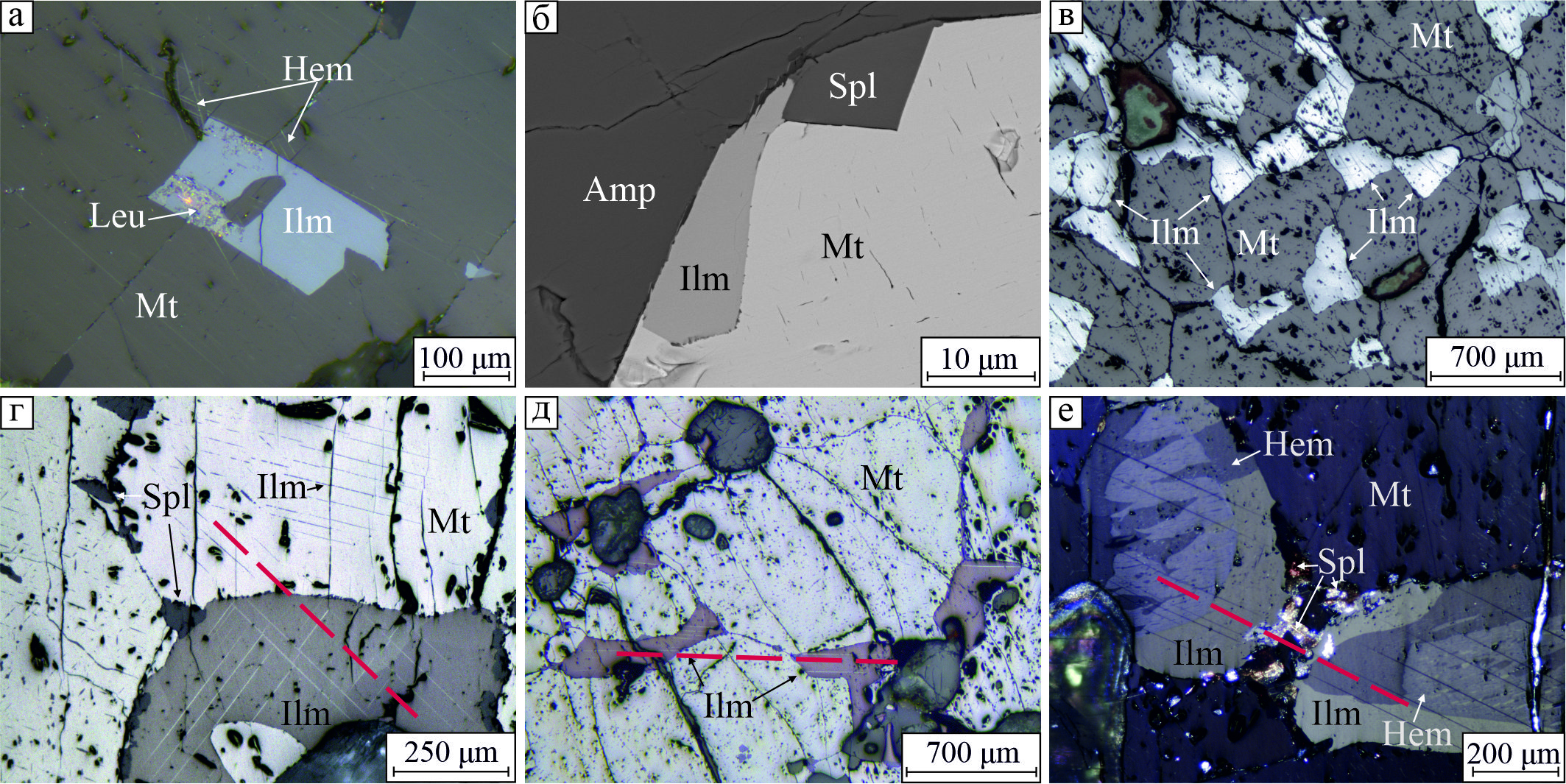 Рис. 12. Разная позиция и ориентировка ильменита по отношению к вмещающим минералам: а – на контакте двух разноориентированных зерен магнетита; б – на контакте амфибола и магнетита; в – зерна совместно с магнетитом; г – параллельная ориентировка пластинчатых двойников в ильмените и пластинок распада шпинели в смежном зерне магнетита; д, е – параллельная ориентировка двойников в различных зернах ильменита (д) и гемоильменита (е). Красные линии подчеркивают совпадение ориентировки рассматриваемых линейных элементов в смежных минералах. Отраженный свет с анализатором (а, г, д, е) и без (в); BSE-фото (б).