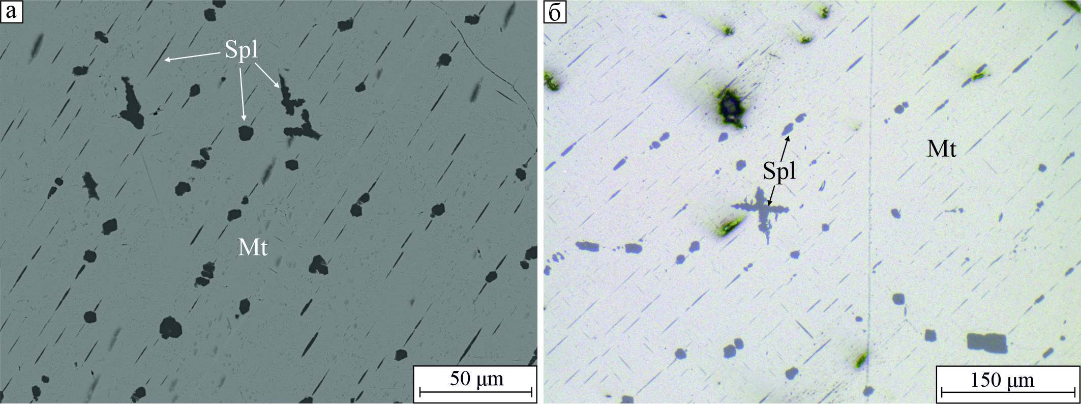 Широко распространенный парагенезис магнетита, ильменита и шпинели в основных магматических породах характеризуется типоморфными структурными особенностями, внимание на которые обращалось еще на заре появления рудной микроскопии. Детальное описание срастаний этих минералов, обычно интерпретируемых как структуры распада твердого раствора, приведено в работах известных минералогов (Швартц, 1934; Бетехтин и др., 1958; Рамдор, 1962). Аналогичный парагенезис был выявлен и описан на карбонатитовых (Ivanyuk et al., 2017) и скарновых (Мазуров и др., 2004) месторождениях.