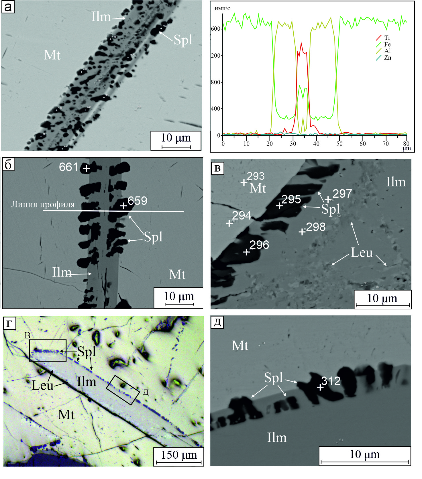 Ильменит в магнетите образует разнообразные по форме и размеру выделения, которые характеризуются закономерной ориентировкой относительно кристаллической структуры магнетита. Широко представлены отдельные пластинки ильменита толщиной первые десятки микрометров, которые по отношению к кристаллам магнетита могут располагаться в центральной части кристаллов (рис. 7а) или на границе магнетита с силикатами (рис. 7б), иногда обрамляя кристаллы магнетита практически со всех сторон (рис. 7в). В случае округлых выделений магнетита кристаллы ильменита часто имеют прямолинейные границы с магнетитом и округлые – с силикатами (рис. 7г).