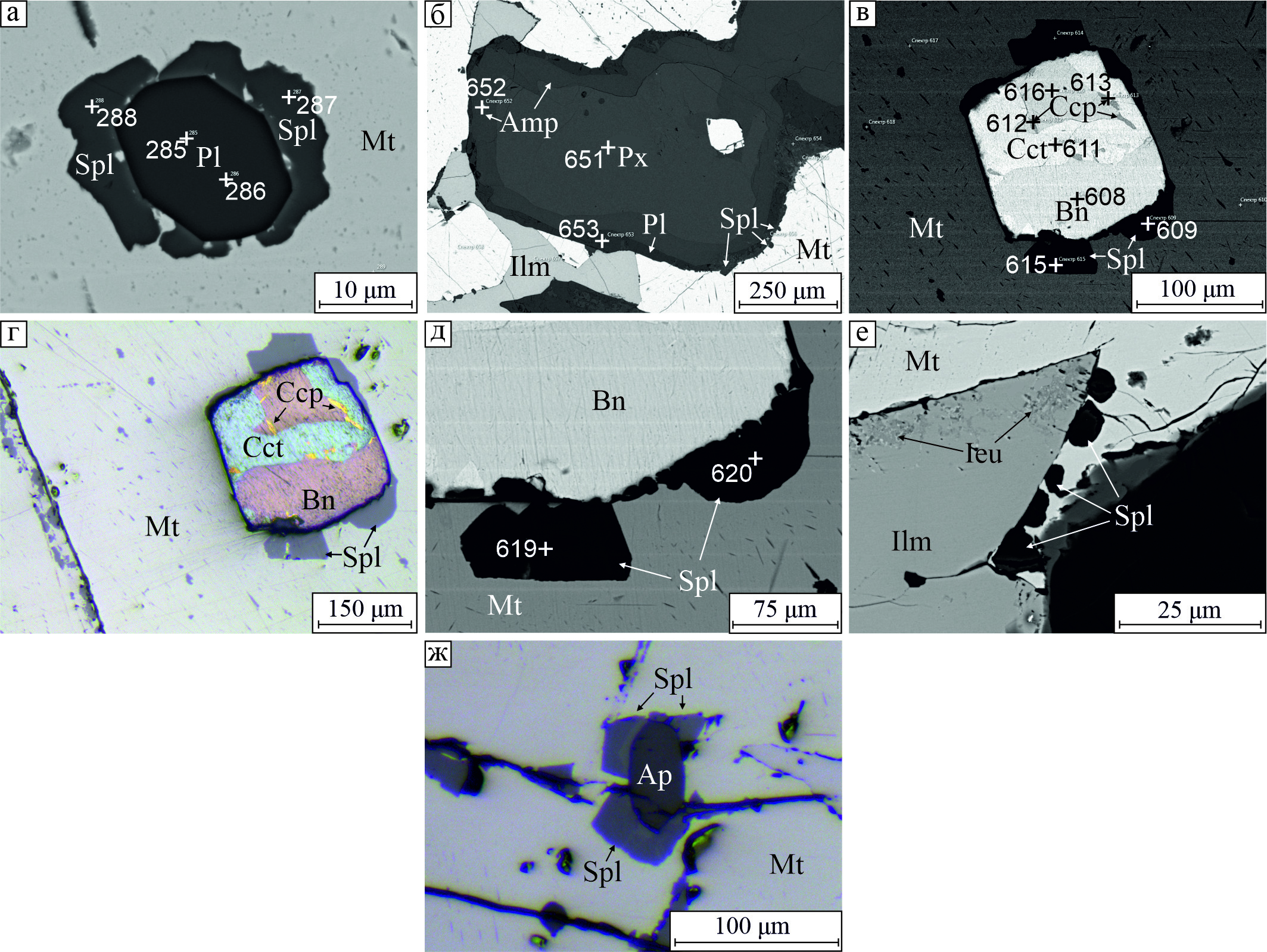 Fig. 17. Spinel confined to the boundaries of magnetite with other minerals: а – anorthite; б – zoned pyroxene-amphibole-anorthite aggregate; в, г, д – chalcopyrite-digenite-bornite aggregate; е – ilmenite; ж – apatite. BSE-images (а–в, д, е), reflected light (г). Ap – apatite, Cct – chalcocite, Px – pyroxene.