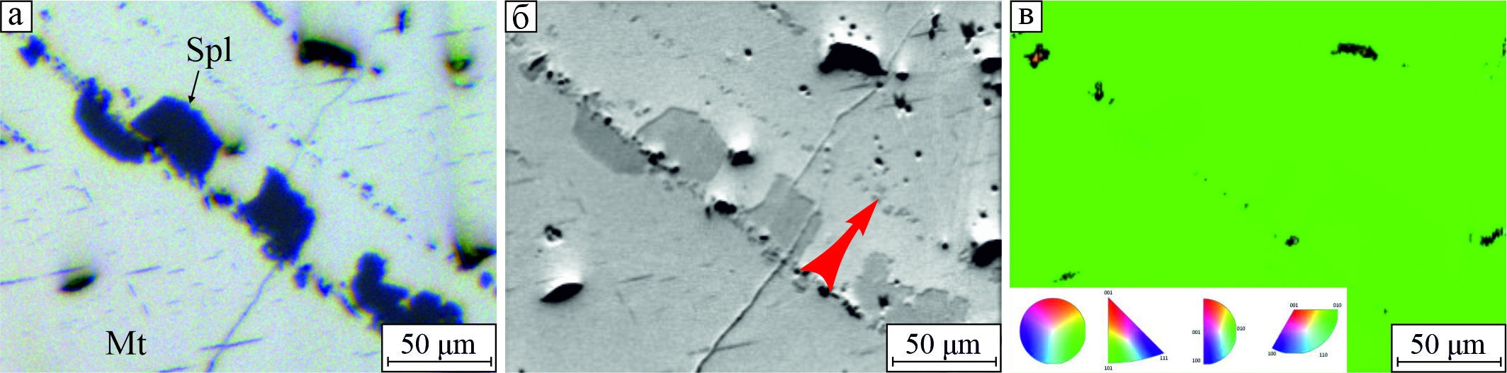 Fig. 18. Spinel crystals confined to the growth zone of magnetite crystal: а – reflected light; б – BSE-image (arrow indicates a possible growth direction of the magnetite crystal); в – map of orientation distribution according to electron back-scattered diffraction indicating a common orientation of spinel inclusions and host magnetite crystal.