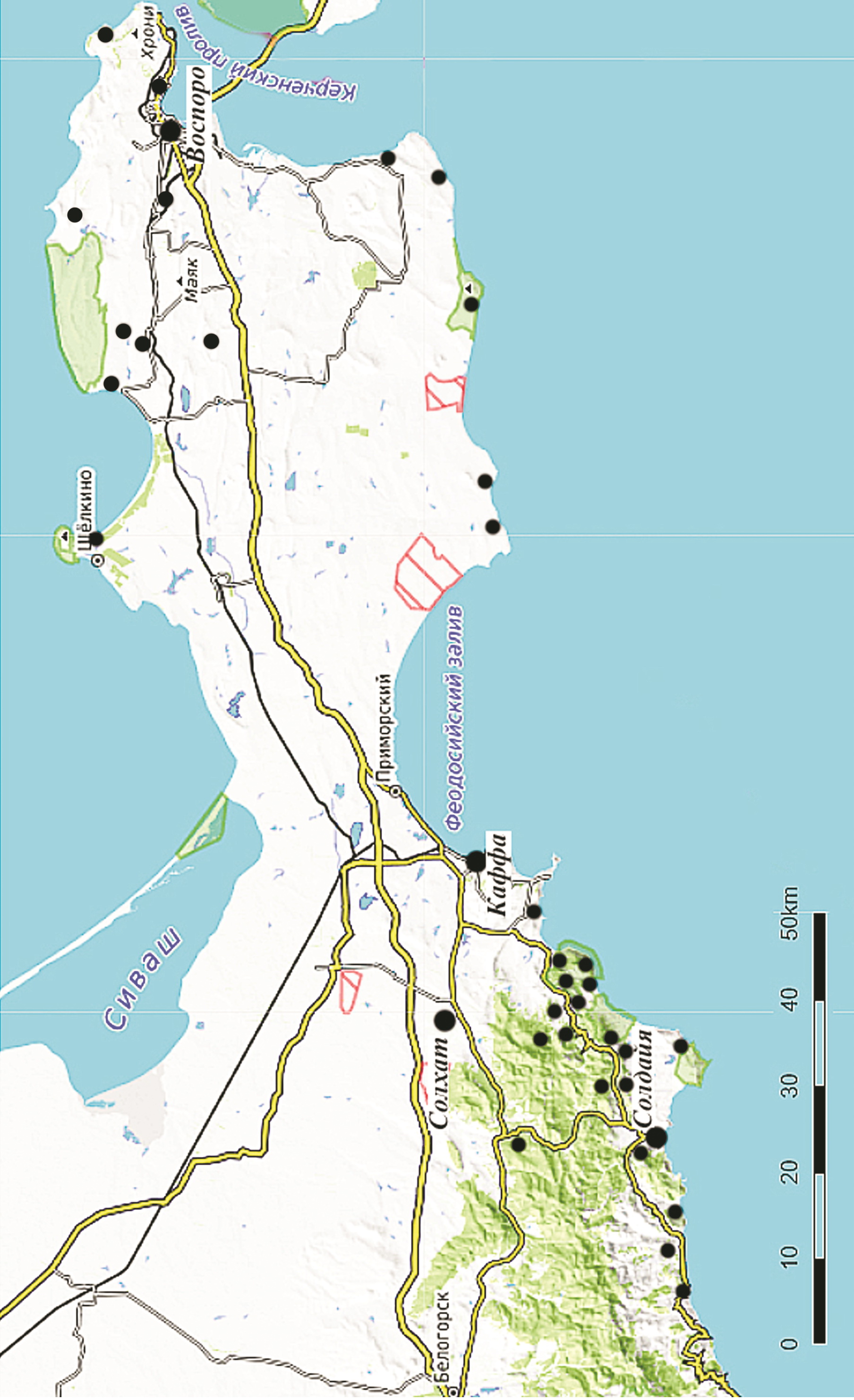 На Керченском полуострове известно 14 памятников интересующего нас времени. Девять из них являются прибрежными поселениями, которые С.Г. Бочаров, сопоставляет с пунктами, нанесенными на средневековые итальянские карты-портоланы [2, с. 37–40].