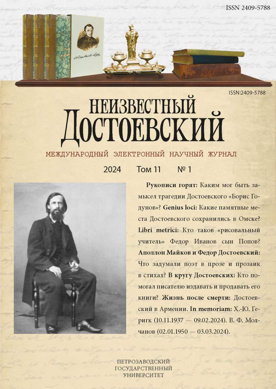 - Drobyshevskaya I. M., Tikhomirov B. N. The Moscow Branch of the Family Tree of F. M. Dostoevsky: New Archival and Printed Sources. In: Neizvestnyy Dostoevskiy [The Unknown Dostoevsky], 2023, vol. 10, no. 1, pp. 5–80. Available at: https://unknown-dostoevsky.ru/files/redaktor_pdf/1681468344.pdf (accessed on January 12, 2024). doi: 10.15393/j10.art.2023.6562. EDN: EQACJR (In Russ.)