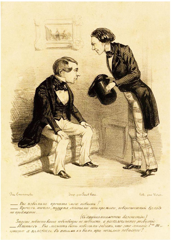 Fig. 4. Caricature by N. A. Stepanov on N. A. Nekrasov and I. I. Panaev. (“Illustrated Almanac,” 1848)