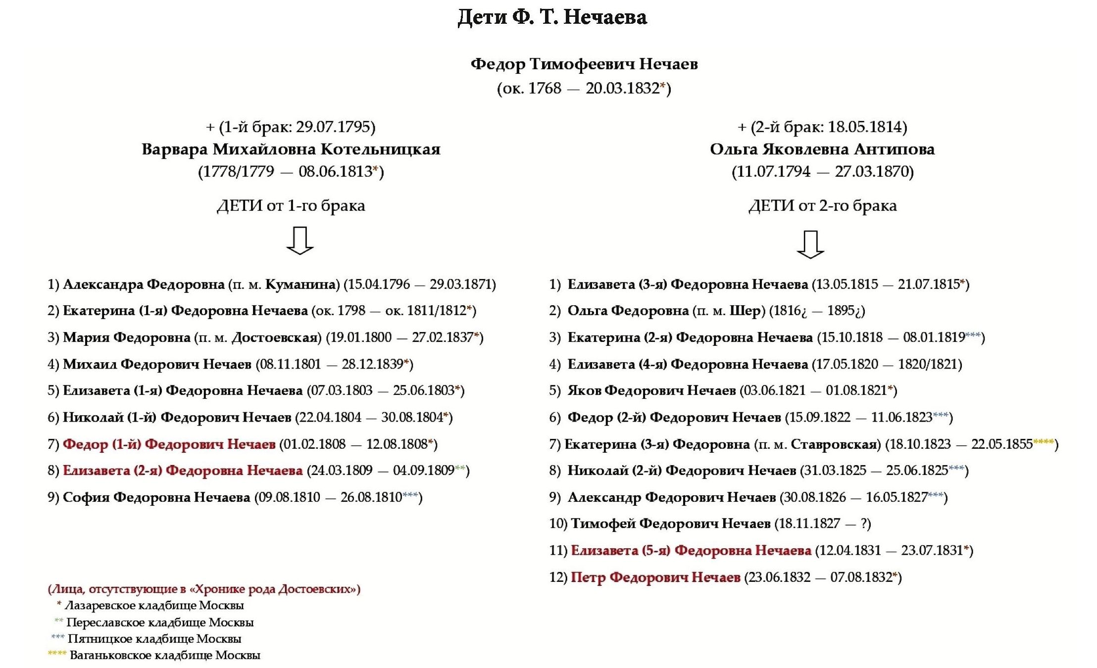 М. В. Волоцкой указал в своей «Хронике…» только двух поименованных мемуаристом дочерей Ф. Т. Нечаева от второго брака: Ольгу и Екатерину (см.: [Волоцкой: 81–82]). Но уже составители Хроники-2012, проведя с подачи А. М. Достоевского необходимые архивные изыскания, установили имена восьмерых умерших в грудном возрасте детей дедушки писателя: начиная с Елизаветы (13 мая — 21 июля 1815) и далее — Екатерина (15 октября 1818 — 8 января 1819), Елизавета (р. 17 мая 1820), Яков (3 июня — 1 августа 1821), Федор (15 сентября 1822 — 11 июня 1823), Николай (31 марта — 25 июня 1825), Александр (30 августа 1826 — 16 мая 1827) и Тимофей (р. 18 ноября 1827) (см.: [Хроника: 191, 195–199]).