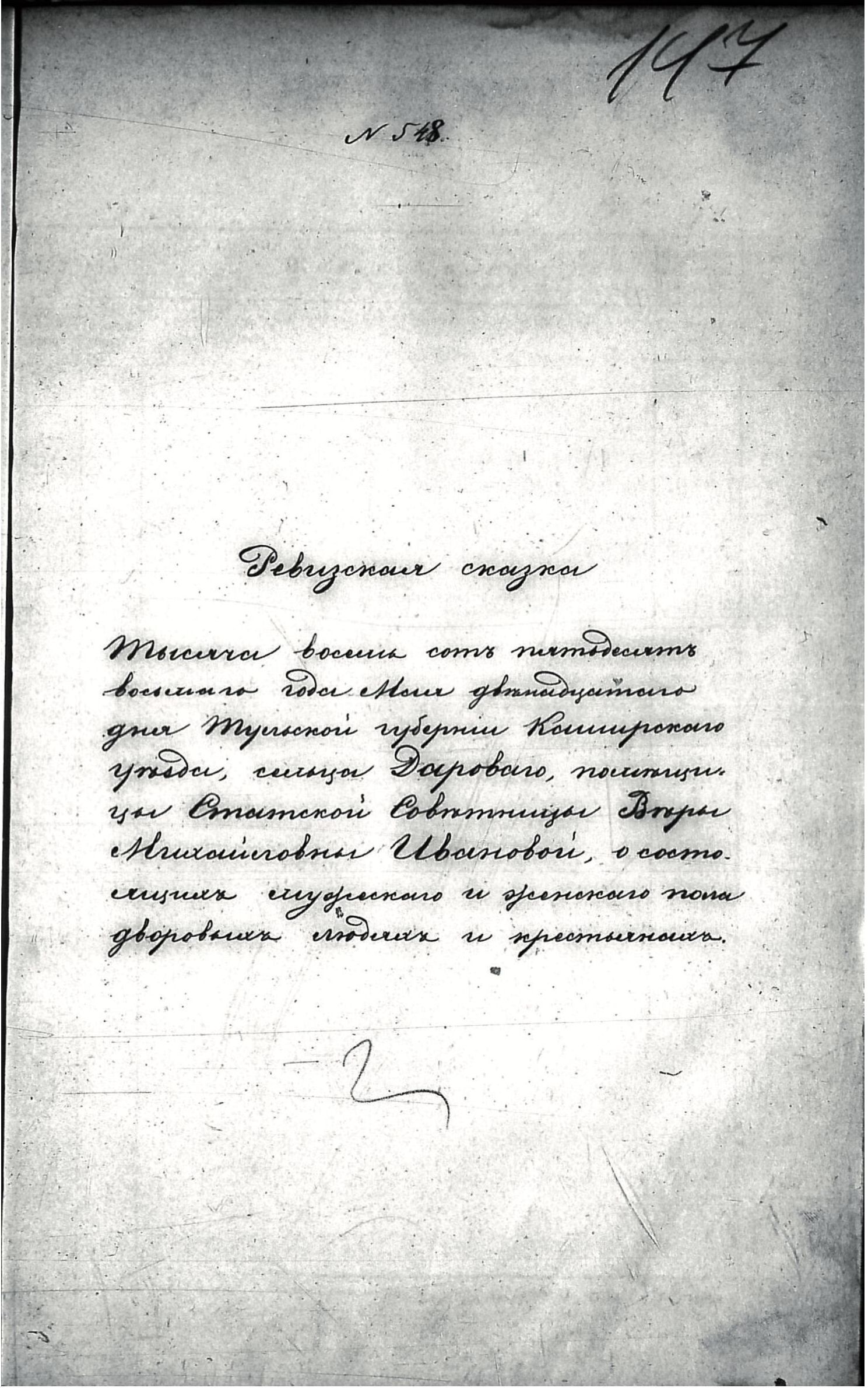 Мария Федоровна подала ревизские сказки 14 февраля 1834 г. (см.: Илл. 1). Судя по документу, в Даровом в это время проживало три семьи дворовых7.