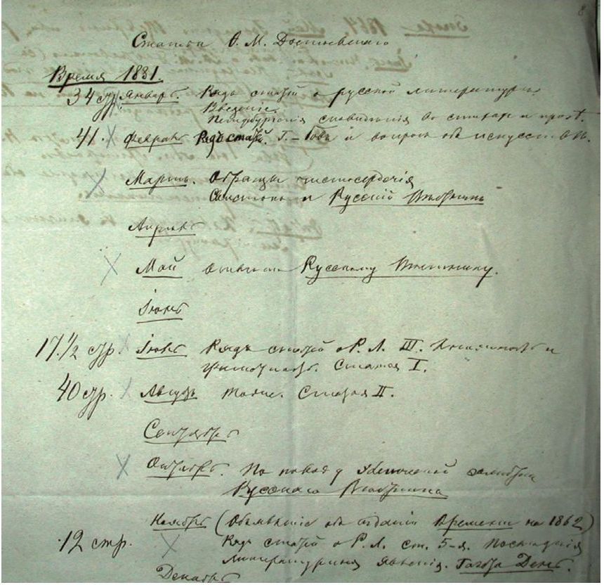 Самая ранняя попытка обсудить эту проблему принадлежит А. Г. Достоевской. При подготовке первого посмертного полного собрания сочинений писателя она обратилась с просьбой к Н. Н. Страхову составить список статей, принадлежащих мужу, провела несколько совещаний с друзьями, сотрудниками и знакомыми, среди которых были К. П. Победоносцев, А. Н. Майков, О. Ф. Миллер, Д. В. Григорович, Н. Н. Страхов, Д. В. Аверкиев, К. К. Случевский и, по ее словам, «еще нѣсколько лицъ хоть и не причастныхъ къ литературѣ, но лично знавшихъ <…> мужа и съ уваженіемъ относившихся къ его произведеніямъ»2. Участники этих обсуждений решали вопрос, какие произведения включать в корпус текстов Достоевского: