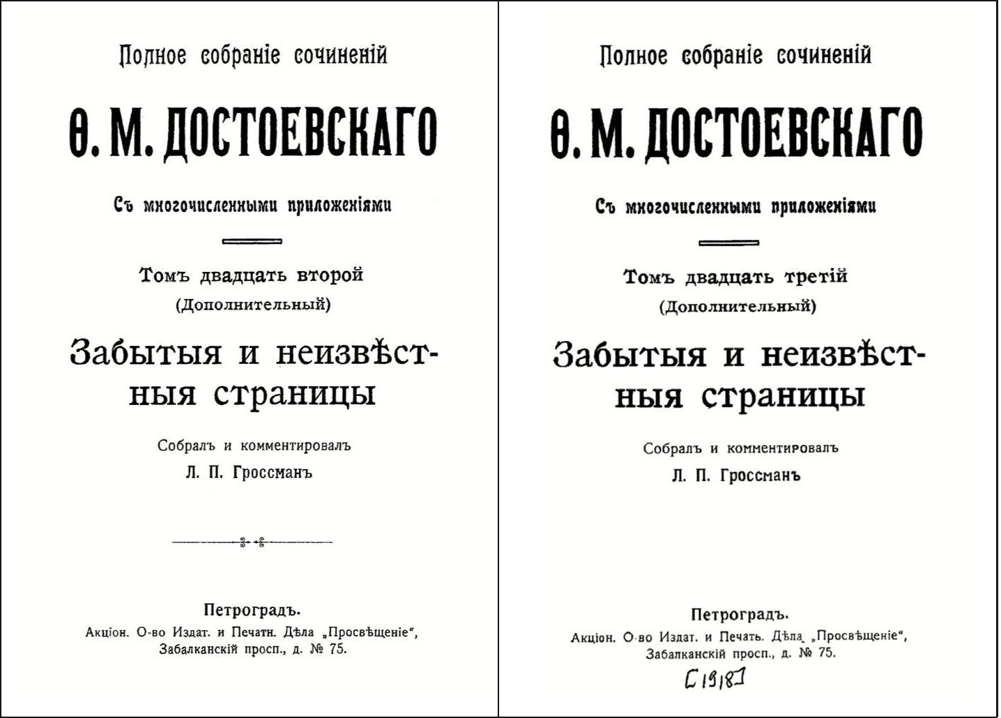 - [Гроссман Л. П.] Комментарии. Дополнения: Забытые и неизвестные страницы // Достоевский̆ Ф. М. Полн. собр. соч.: в 23 т. Пг.: Просвещение, 1918. Т. 22. 279 с.; Т. 23. 525 с. (b)