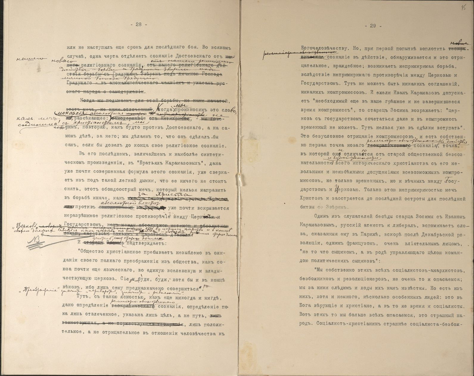 Мережковский сделал вставку: «нашего нового религиозного сознания», вычеркнул прежний текст и вписал: «от нашего религиозного действия — борьбы с Грядущим Зверем под личиной Господа Грядущего»42. Затем он снял фрагмент: «Когда мы подымаем для этой борьбы, не нами начатой, этот меч, не нами отточенный» и начал абзац со слов: «Когда мы произносим это слово, рассекающее: самодержавие — от Антихриста, мы говорим, повторяю, как будто против Достоевского, а на самом деле, за него; мы делаем то, что он сделал бы сам, если бы довел до конца свое религиозное сознание»43. Здесь Мережковскому пришлось скорректировать высказывание, он вычеркнул и вписал: «Когда мы произносим это слово, рассекающее: монархия абсолютная не соединима с христианством…»44.