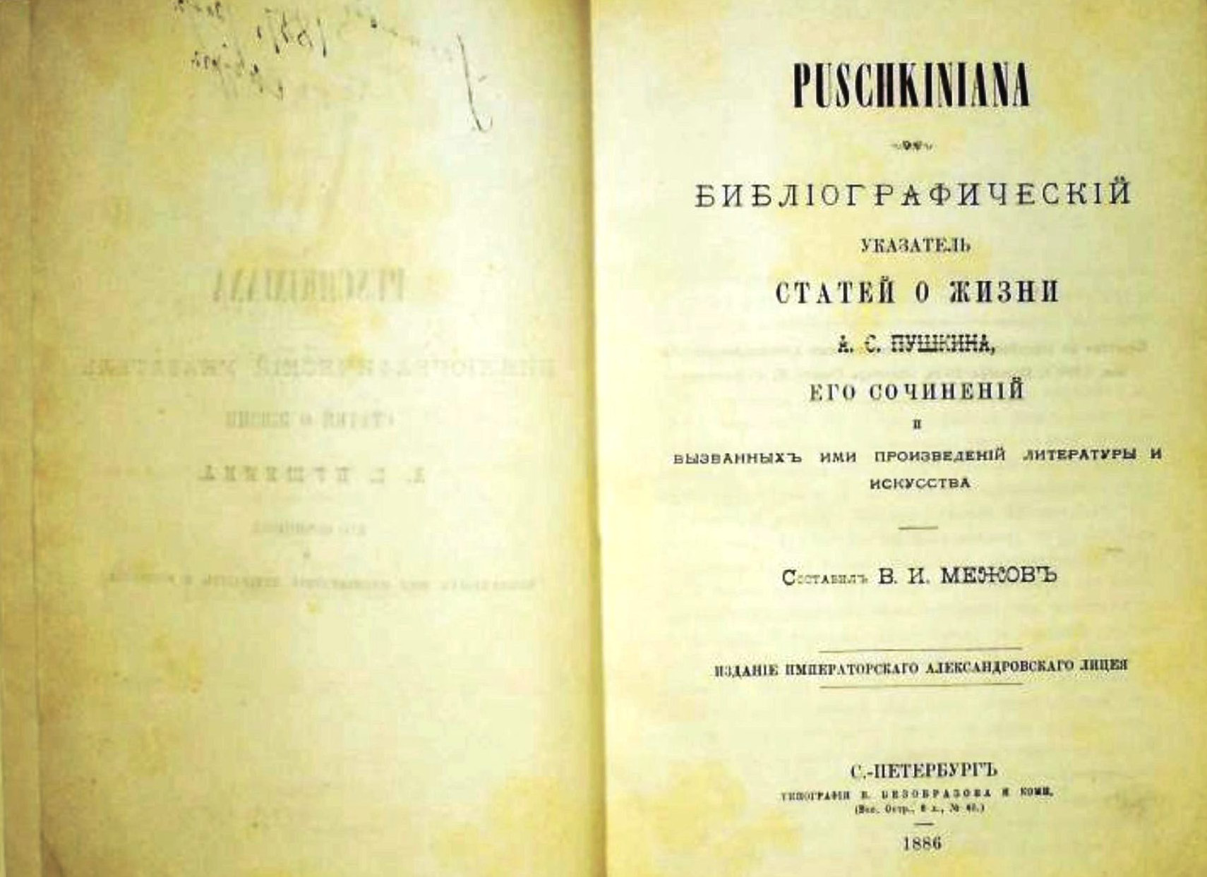 - Mezhov V. I. “Puschkiniana”: bibliograficheskiy ukazatel’ statey o zhizni A. S. Pushkina, ego sochineniy i vyzvannykh imi proizvedeniy literatury i iskusstva [“Puschkiniana”: Bibliographic Index of Articles About the Life of A. S. Pushkin, His Works and the Works of Literature and Art Caused by Them]. St. Petersburg, Aleksandrovskiy litsey Publ., 1886. 406 p. (In Russ.)