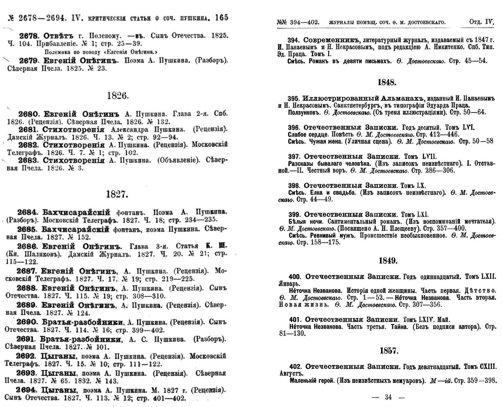 Библиограф Достоевского выписала все короткие версии заголовков разделов из пушкинского каталога и на их основе составила аналогичные заголовки для своего труда.