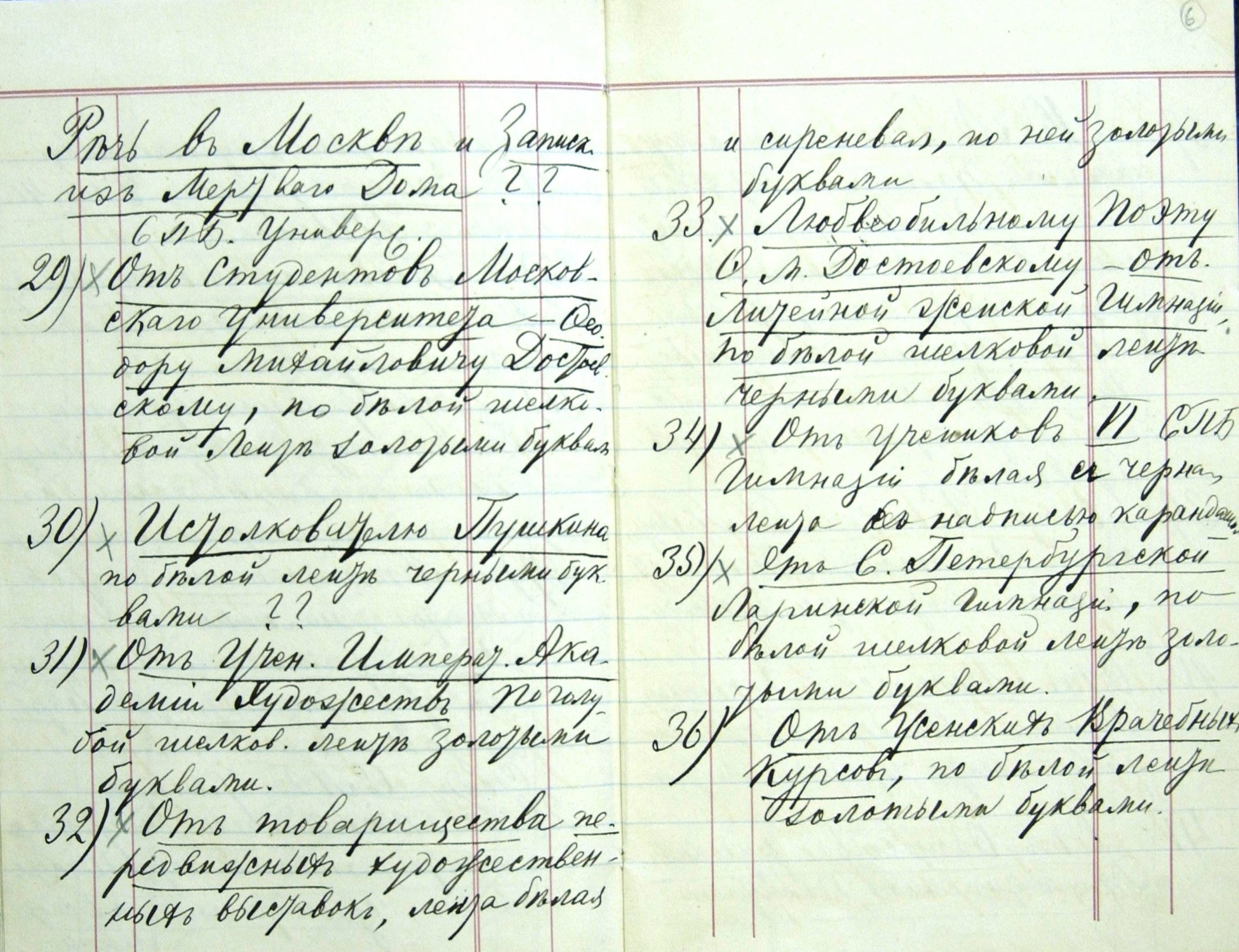 В начале 1881 г. на похороны писателя поклонники принесли венок с белой лентой, на которой черными буквами было написано: «Истолкователю Пушкина». Анна Григорьевна сохранила эту траурную ленту наряду с другими в отдельной коробке и описала в своей записной книжке (всего ею описаны 43 ленты с венков с надписями и 5 лент без надписей) (Илл. 7)37.