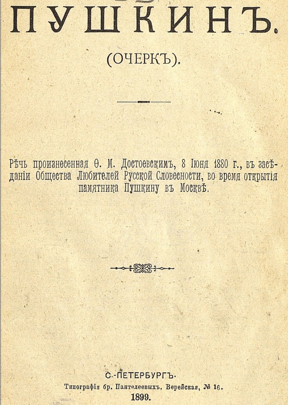 40 Достоевский Ф. М. Пушкин: (Очерк): Речь, произнесенная Ф. М. Достоевским, 8 июня 1880 г., в заседании О-ва любителей рус. словесности, во время открытия памятника Пушкину в Москве. СПб.: Тип. бр. Пантелеевых, 1899. 18 с