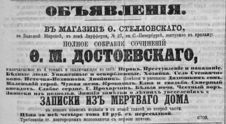 Между тем в конце 1870 г. Стелловский выпустил четвертый том Полного собрания сочинений Достоевского с романом «Преступление и Наказание», о чем сообщил в объявлении, опубликованном в газете «Голос» (1870. № 342. 11 (23) декабря).