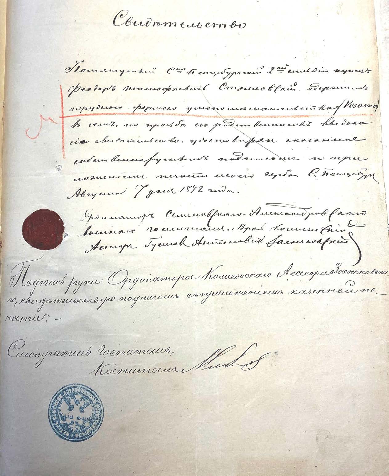 Илл. 5. Заключение врача о болезни Стелловского от 7 августа 1872 г.38