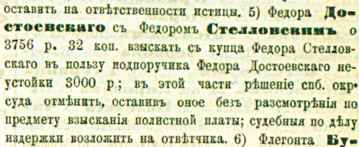 9 ноября 1873 г. на заседании Петербургской судебной палаты состоялось рассмотрение «апелляционного дела Федора Достоевского с Федором Стелловским о 3756 руб. 32 коп.». Постановлено было «взыскать с купца Федора Стелловского в пользу подпоручика Федора Достоевского неустойки 3000 руб.» [Достоевский; т. 291: 531]. Несмотря на то, что Губин и Достоевский подавали иск на сумму 3870 руб., суд не удовлетворил требование взыскать полистную плату (см. Илл. 6)44. Однако деньги получить не удавалось, потому что ни опись, ни арест магазина Стелловского в 1873 г. так и не были произведены.