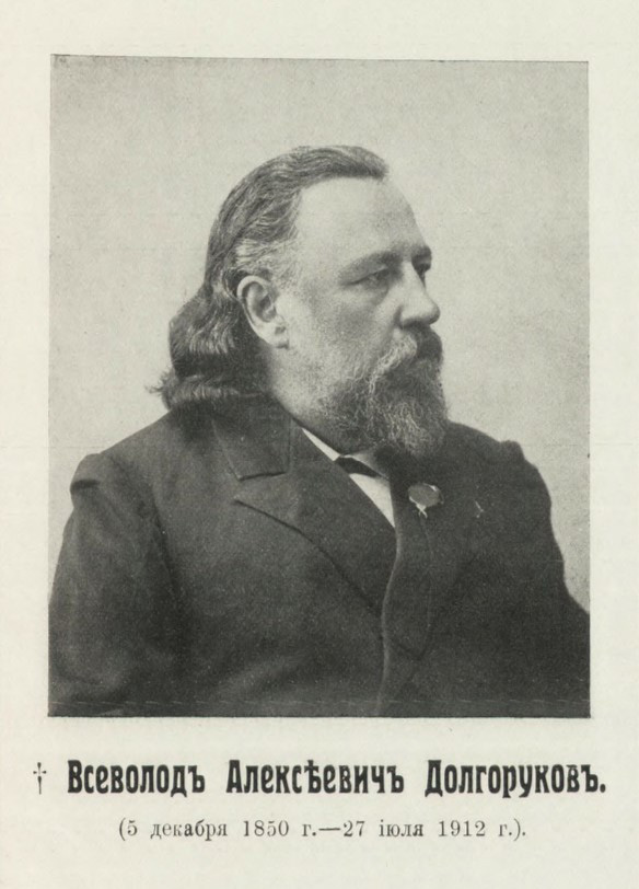 Кроме того, в документах Мариинской городской управы имеется паспортная характеристика Долгорукова на 1896 г.: «Приметы: лета — 46. Рост — 2 аршина 6 вершков <…>. Волосы и брови — темнорусые, глаза — серые. Нос обыкновенный. <…> Подбородок — лицо — чистые. Особые приметы — нет»5. Еще одно свидетельство, указывающее на рождение Долгорукова в 1850 г., приведено в издании Е. М. Баранцевича, посвященном его памяти6. В нем размещена фотография В. А. Долгорукова, под которой указаны даты его жизни: «5 декабря 1850 — 27 июля 1912».