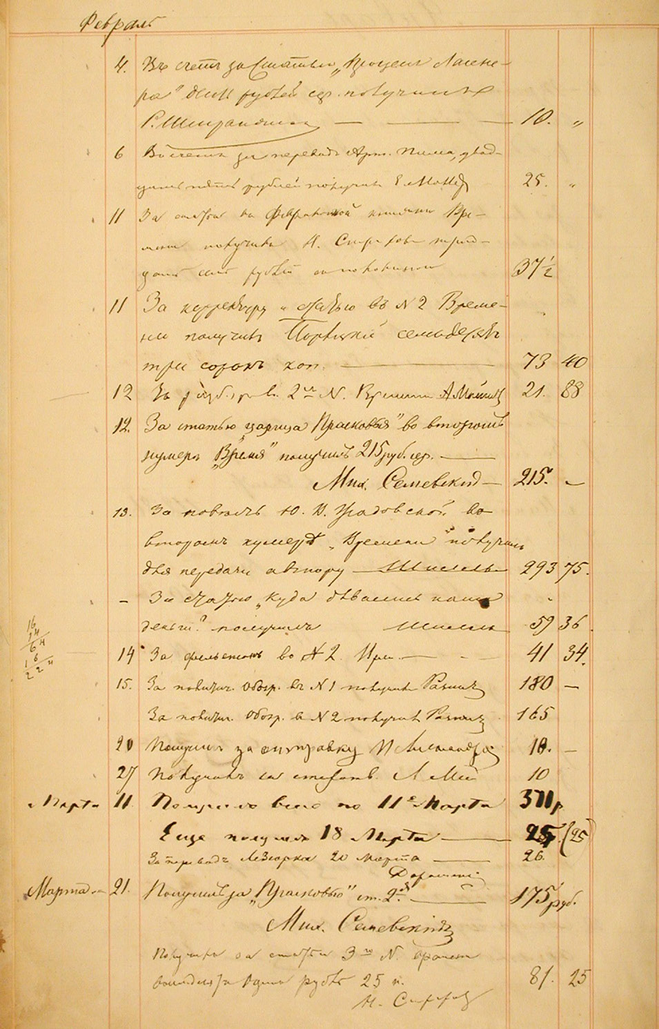 Илл. 2. Страница из приходо-расходного журнала по изданию «Времени» с подписями М. И. Семевского в получении гонораров