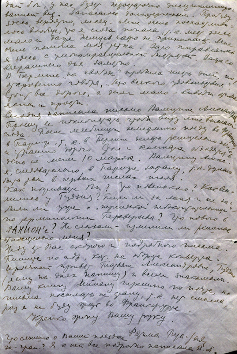 Отдельные подробности биографии, черты характера и широкие дружеские связи раскрываются в пяти письмах Ф. Риза-Заде. Три письма адресованы Ю. М. Соколову4: два — из берлинской клиники Westend Krankenhaus, где Фатима проходила курс лечения от диабета (даты: 01.06.1929 г. и 25.06.1929 г.), третье письмо написано из Москвы (дата: 20.08.1929 г.). Также сохранились два письма, адресованных Г. А. Шенгели5: насыщенное образами Востока письмо из Тегерана (дата: 03.09.1930 г.) и послание из Вены, рассказывающее о новом курсе лечения (дата: 14.11.1930 г.). Письма воссоздают облик молодой, исполненной творческих планов исследовательницы, вынужденной бороться с тяжелой болезнью. Г. А. Шенгели она с сожалением писала о своих неосуществленных намерениях «провести зиму в Париже и писать там диссертацию о Марселе Прусте, даже на французском языке»6. В письмах вырисовывается коллективный портрет друзей и коллег адресанта: Н. К. Гудзия7, В. Ф. Переверзева8, В. А. Дынник-Соколовой9.