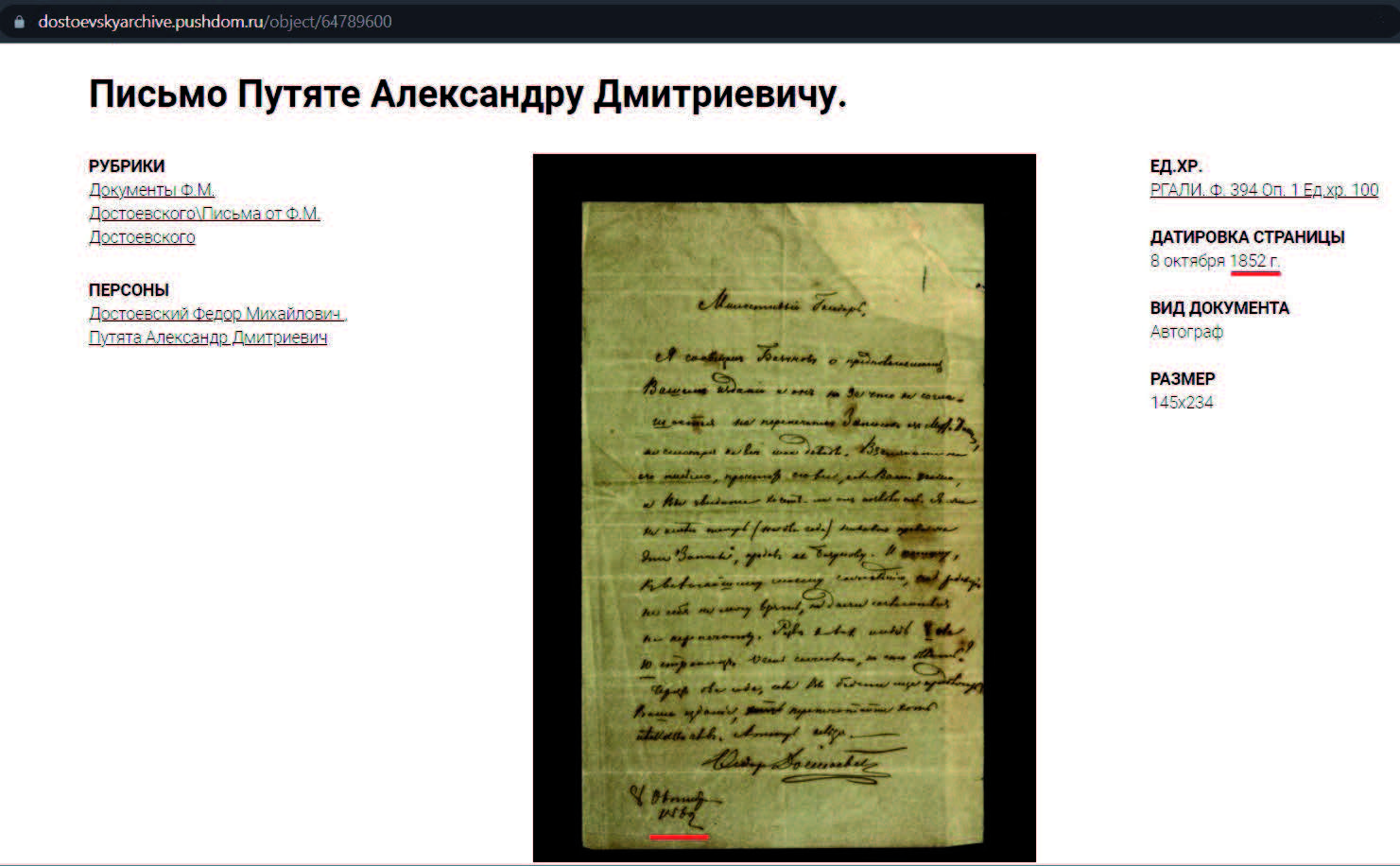Fig. 4. Fyodor Dostoevsky’s calligraphic note
