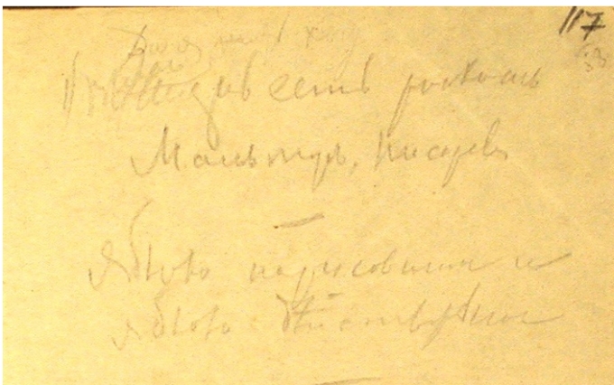 Илл. 5. Надпись на конверте рукой А. Г. Достоевской (ОР РГБ. Ф. 93.I.3.13; наборная рукопись фельетона «Из дачных прогулок Кузьмы Пруткова»)