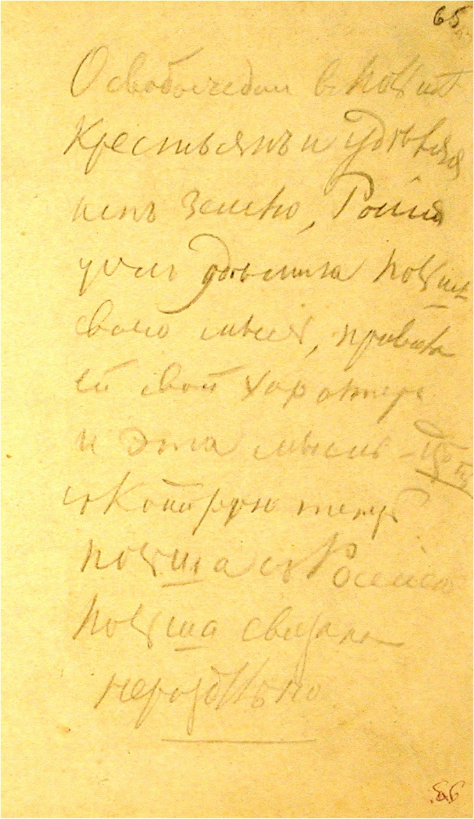 Февраль–март 1864 г. Одна из первых возможных записей, сделанных в начале 1864 г., — это запись на с. 65, где Достоевский рассуждает об освобождении польских крестьян, которое произошло 19 февраля 1864 г: «Освобождая въ Польшѣ крестьянъ и удѣляя имъ землю, Россiя ужъ удѣлила Польшѣ свою мысль, привила ей свой характеръ и эта мысль — цѣпь съ котор[у]{о} ю теперь Польша съ Россiею Польша связана нераздѣльно» (см.: Илл. 17). Журнал «Время» был закрыт из-за «польского вопроса», теперь Достоевский вновь осторожно возвращается к польской теме. Возможно, эти рассуждения связаны с записями на с. 24–25 и работой над «Политическим обозрением» и статьей «Что такое польские восстания» (см. выше).
