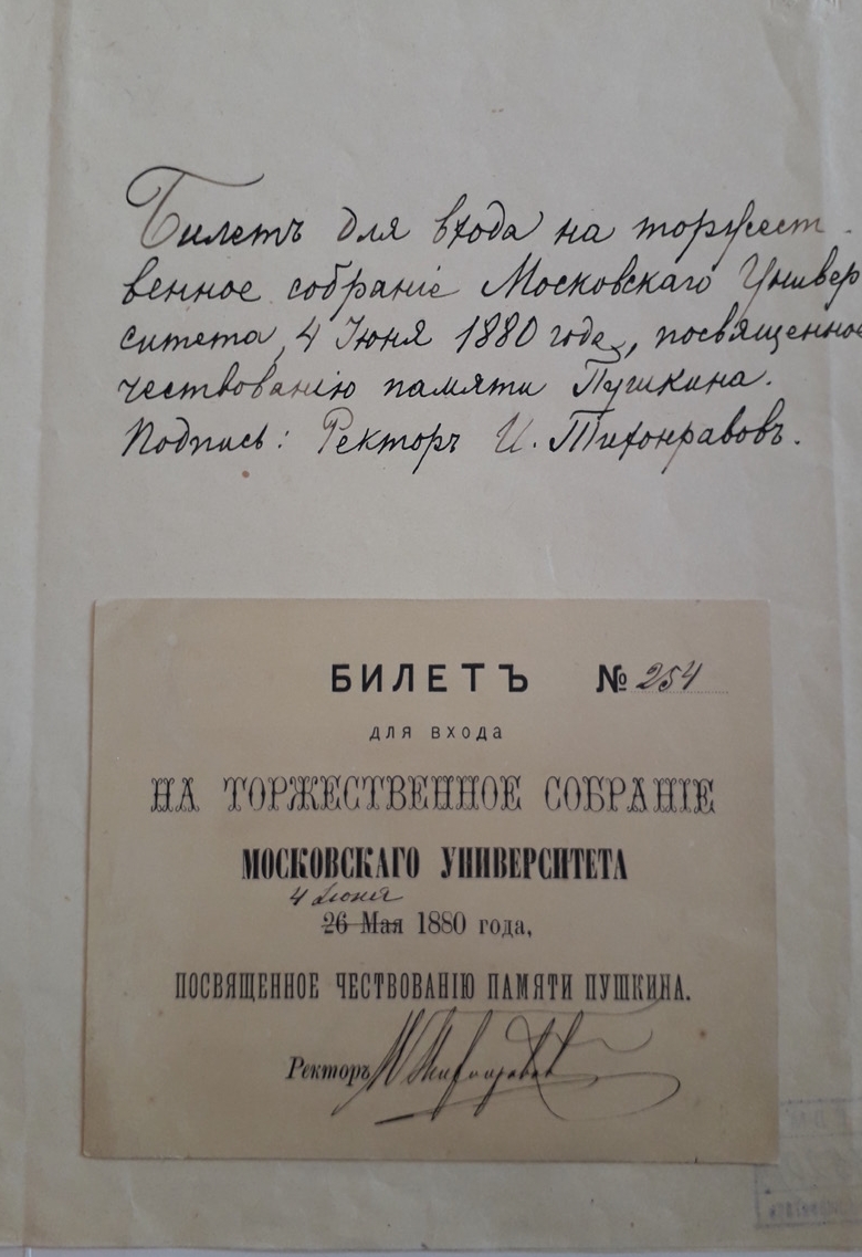Особенно следует отметить два документа, посвященных Пушкинскому празднику 5–8 июня 1880 г., — это билет Ф. М. Достоевского № 254 для входа на торжественное собрание Московского университета и меню обеда в честь открытия памятника А. С. Пушкину (см. Илл. 6–7). Отметим, что первоначальная датировка пригласительного билета — 26 мая 1880 г. — не случайно исправлена чернилами на 4 июня. Первый день праздника намечался на 26 мая 1880 г. — день 81-й годовщины со дня рождения поэта. Но в связи с кончиной императрицы Марии Александровны и объявленным государственным трауром торжества были перенесены. Согласно Летописи, 4 июня Достоевский обедал в трактире Тестова, 5-го — в гостинице, а думский торжественный обед состоялся уже 6 июня [Летопись: 427–429]. Оба документа, наряду с многочисленными газетными откликами и воспоминаниями о Пушкинском празднике, позволяют ощутить, насколько торжественно и масштабно было обставлено это событие.