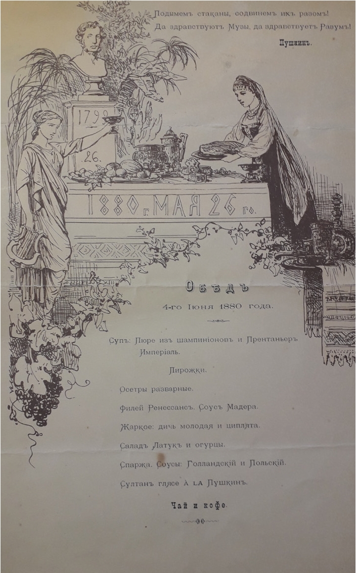 Илл. 7. Меню обеда в честь празднования дня рождения А. С. Пушкина. Рис. К. А. Трутовского. ОРФ ГЛМ. Ф. 81. Оп. 1. Ед. хр. 8